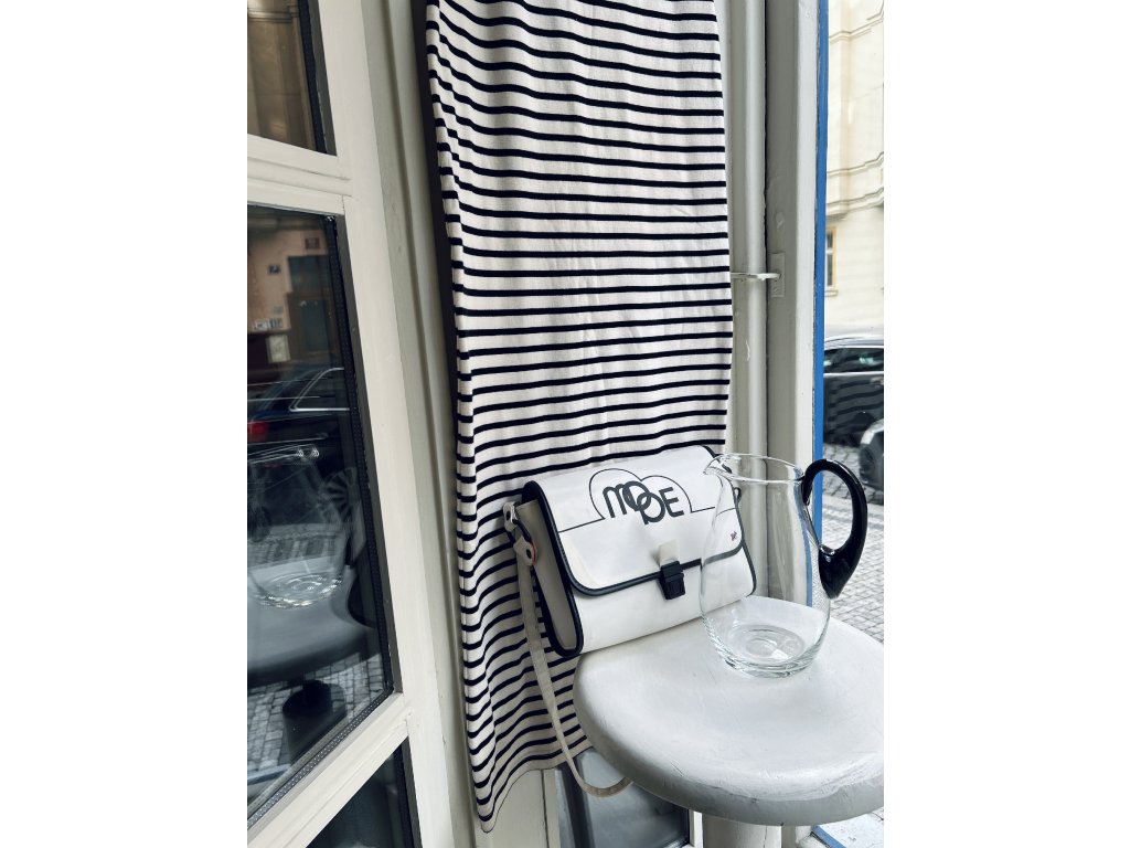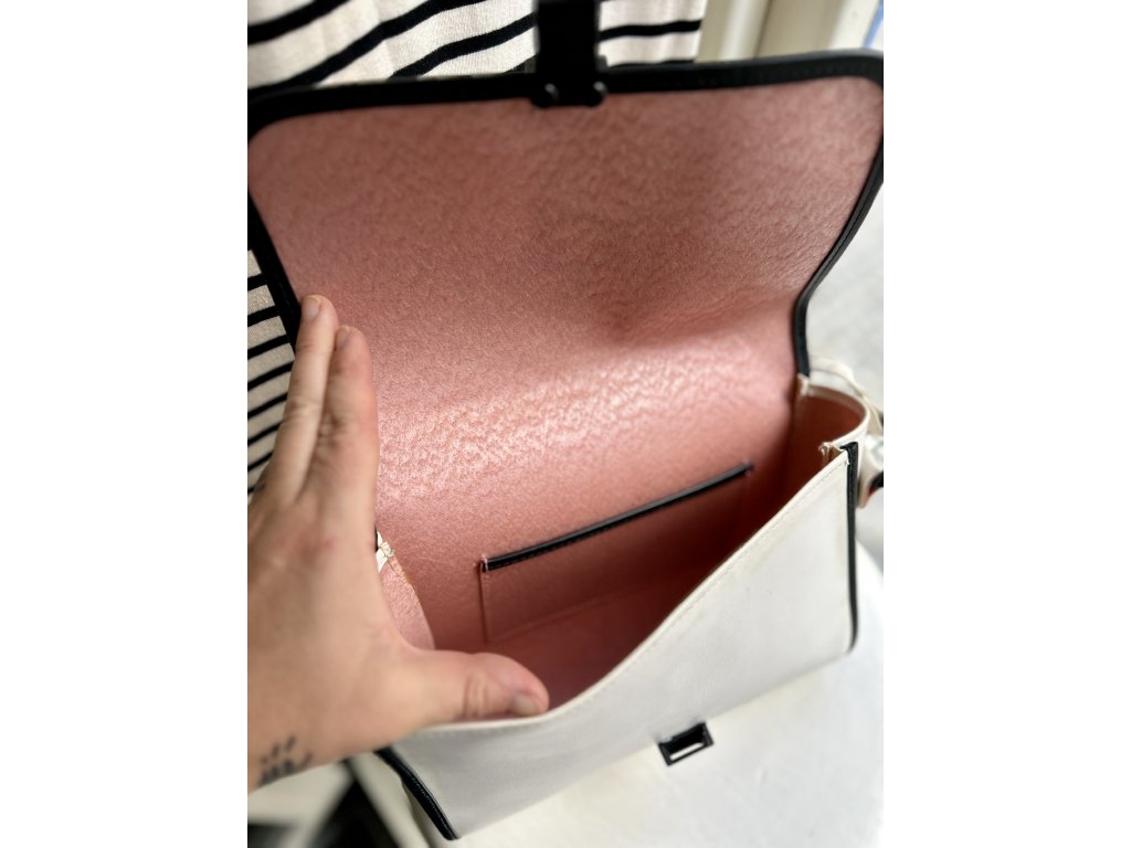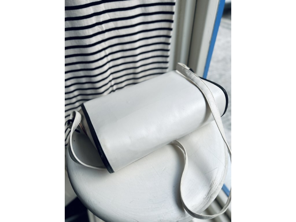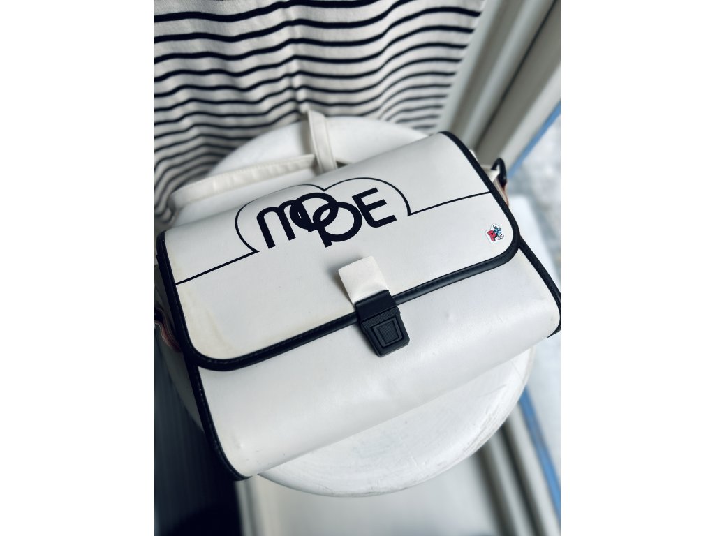 Vintage osmdesátková kabelka, fashion statement tehdejší mládeže, která měla štěstí na příbuzné na západě od hranic. Šitá ze silné koženky s výrazným designem, kterému dominuje nápis MODE. Uvnitř překvapivě lesklý růžový povrch a bez vady, jen s lehkými stopami času na bílé. Rozměry 26 x 19 x 9 cm, kratší holčičí popruh a jako punc originality jsem ponechala samolepku Šmouly s písmenem P - šmoulí abeceda byla v letech 1980s hit! Najde zase svoji Petru, Pavlu, Penelopu…?