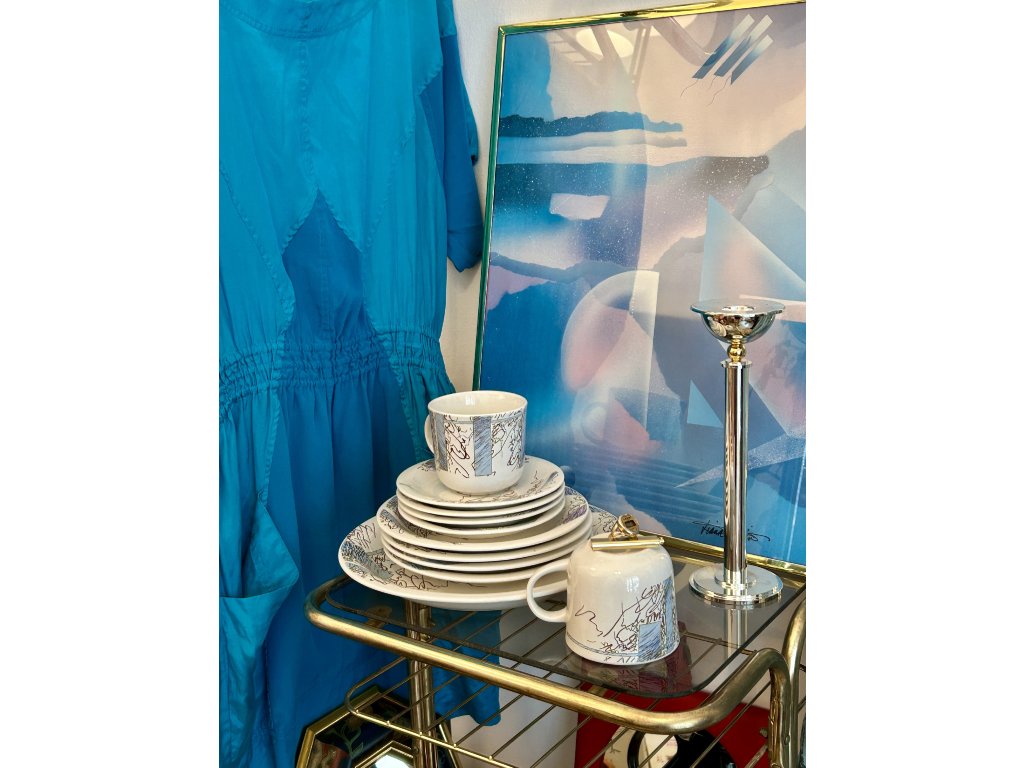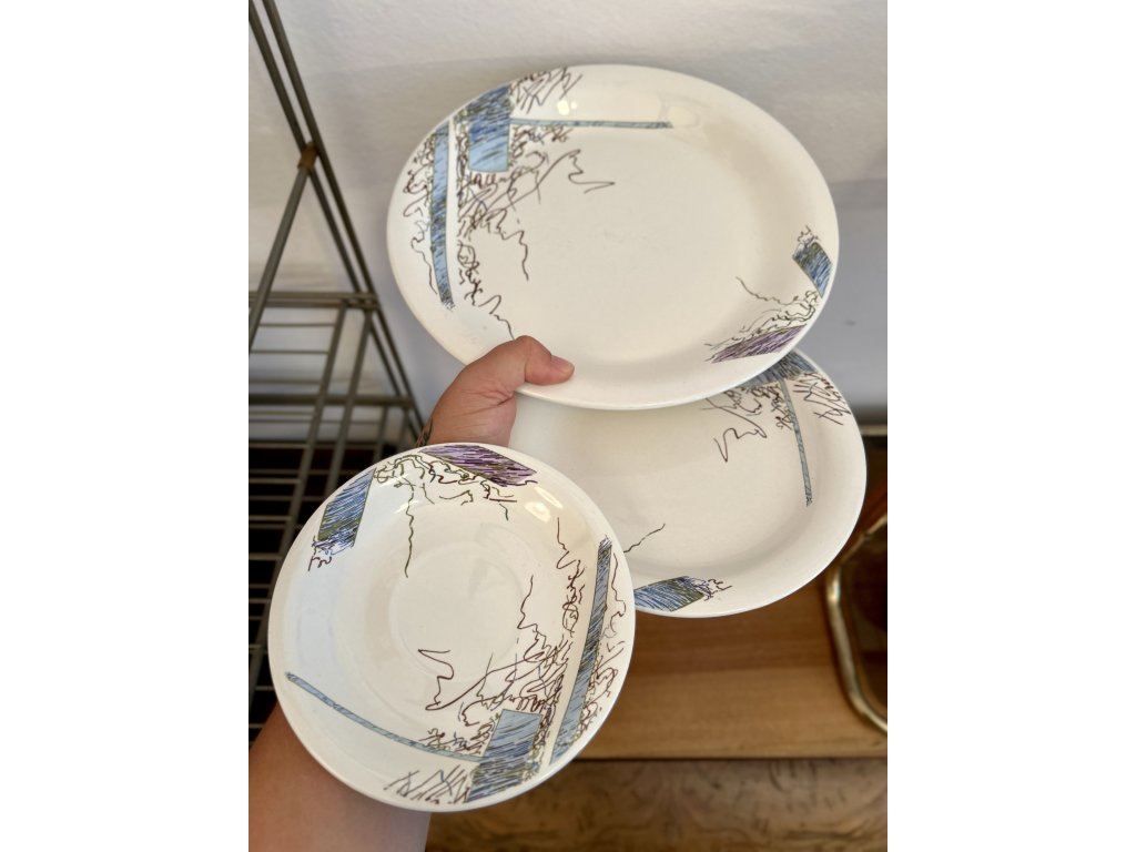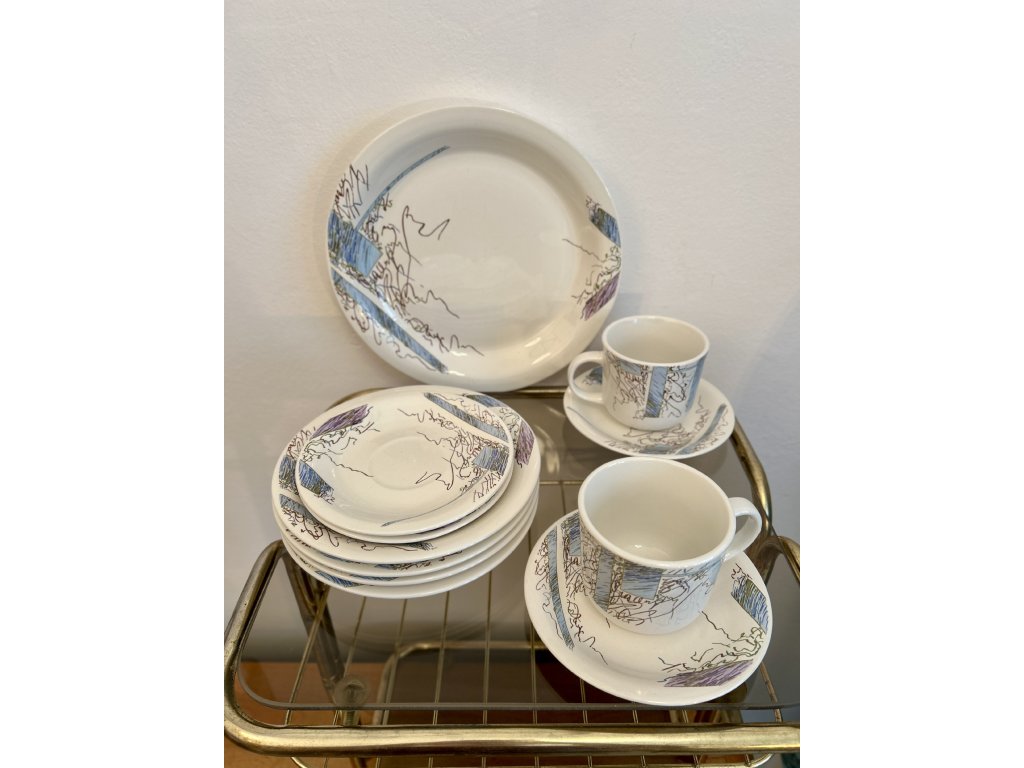 Povedená sada silnostěnného porcelánu s výrazným osmdesátkovým dekorem připomínající skicu černou tuší se světle modrými a fialovými plochami. Nic pro 1980s romantiky, spíš pro umělecké rozlítané typy. 1x velký 26cm talíř (lehčí známky používání), 4x dezertní 20cm talíř, 4x malý 15cm talířek a 2x velký hrnek s ouškem (objem 220 ml). Záhadou je, že ani jeden kousek není značený a celý internet o něm nic neví. Tenhle porcelán tedy jen tak někdo další mít nebude. :) Vše v pěkném vintage stavu bez oťuků, určitě vhodný i do myčky.
