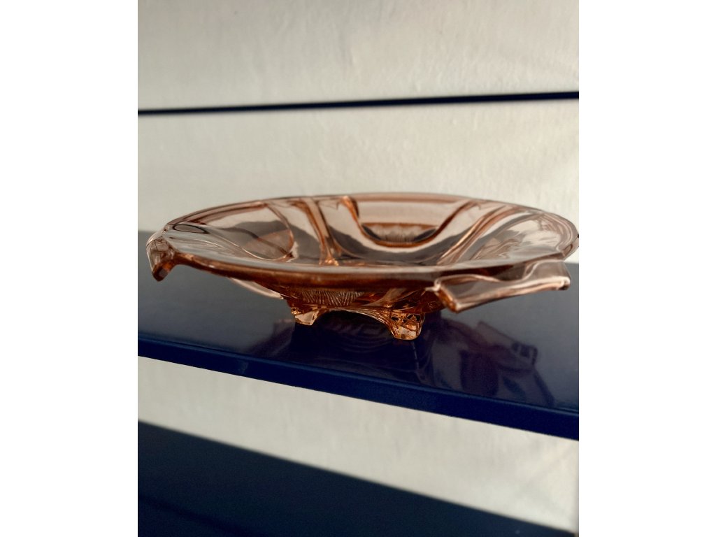 Impozantní sběratelská mísa německé sklárny Walther & Söhne v rosalínové barvě. Má až skulpturální formu: na vyšších nožičkách je usazená mísa s převislými lemy a tu zdobí hluboké profily a žebrování. Jablka v ní budou vypadat jak fancy občerstvení na vernisáži v galerii! Zvrchu perfektní stav, zespod malé odřeninky a štípnutí na lemech, což zohledňuji v ceně. Průměr 32 a výška 8 cm.