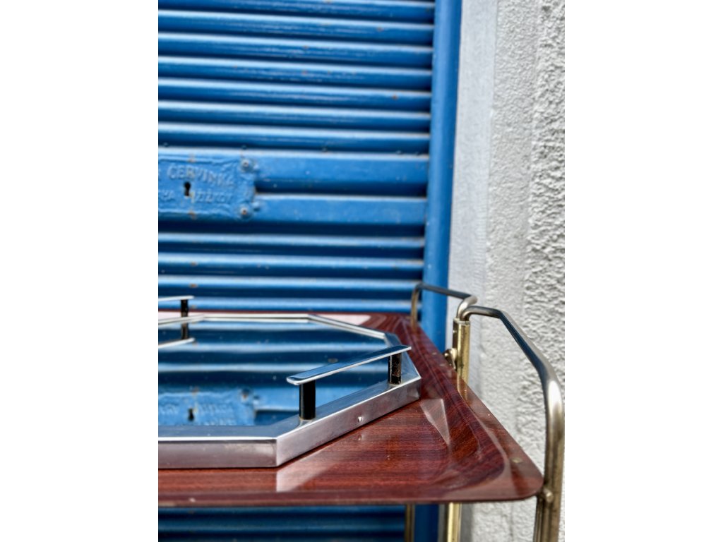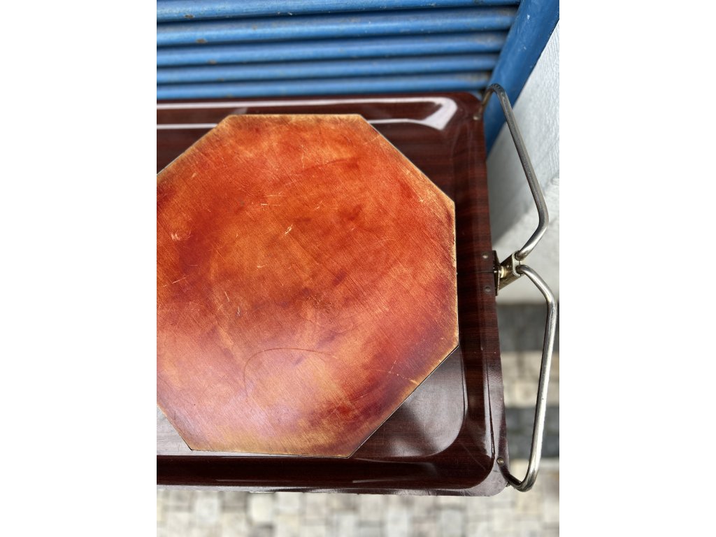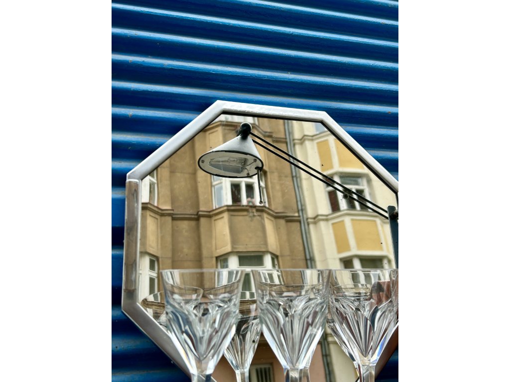 Nádherný servírovací art deco tác tvořený zrcadlovým podnosem v chromované montáži s uchy. Má tvar osmiúhelníku, po stranách ho zdobí dvě praktická madla a pevnost zajišťuje dřevěné dno. Zrcadlo má pár tmavých skvrnek, ale kdo je ve 100 letech nemá?