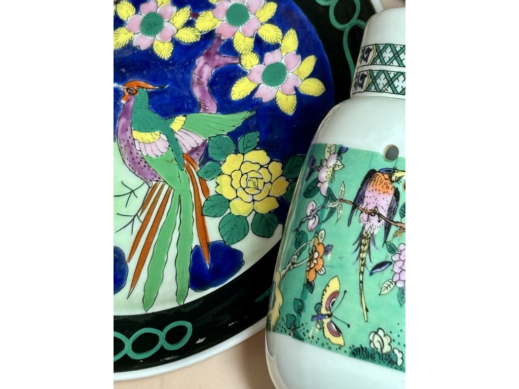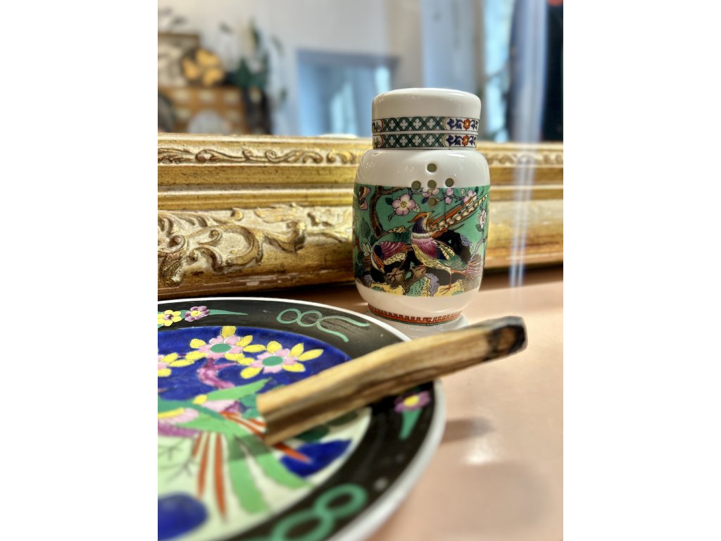 Porcelán je dekorovaný bohatým potiskem bažantů, rozkvetlých stromů a motýlů. Výška 14 cm, v krásném stavu, s malinkým vláskem na šroubovacím víčku.