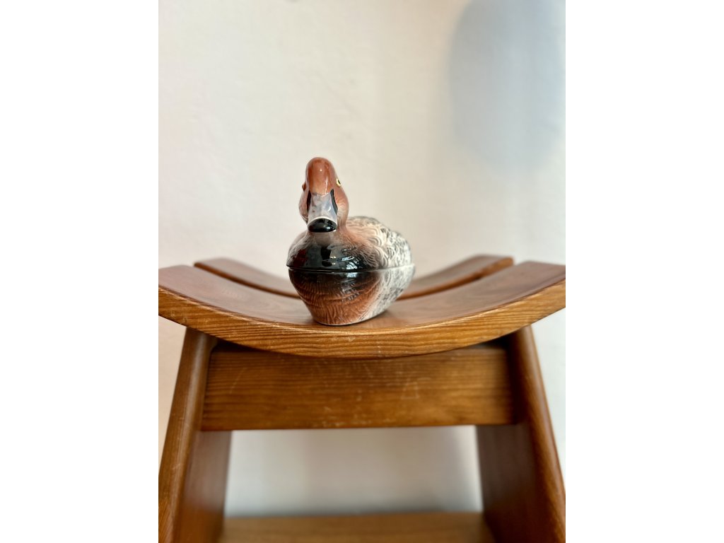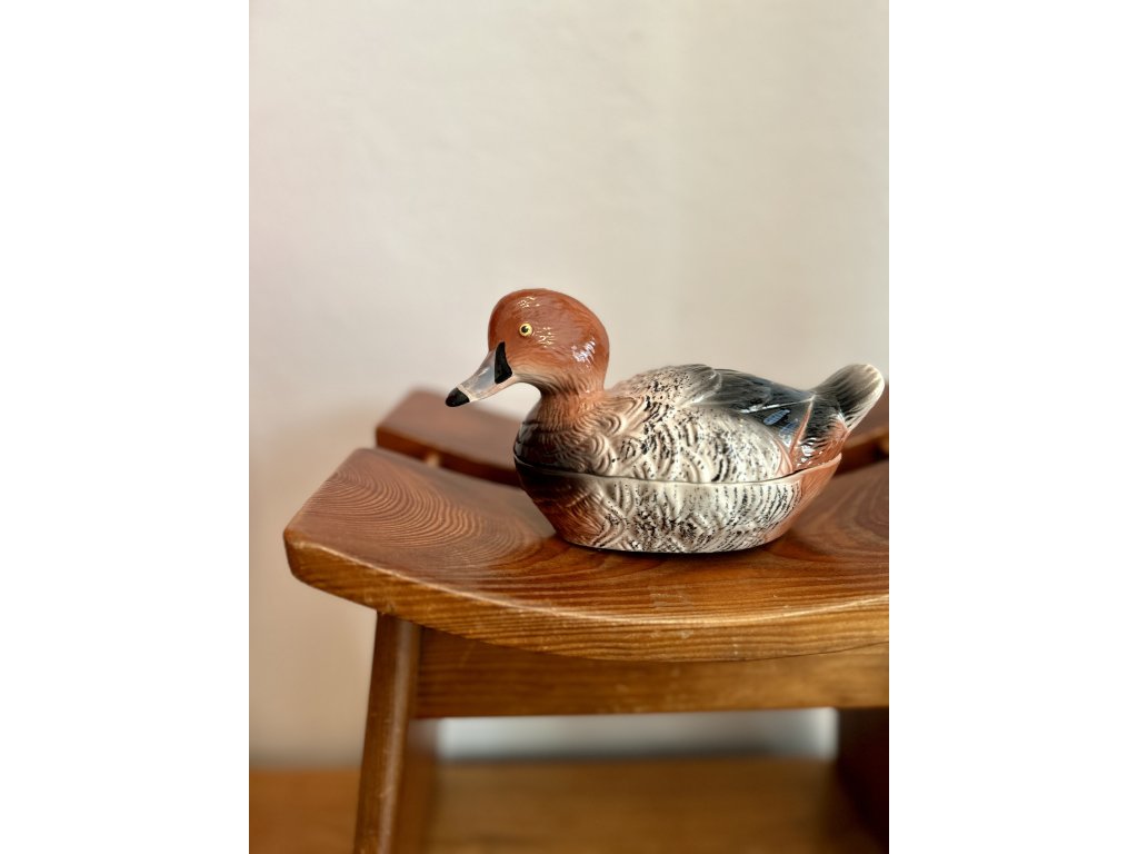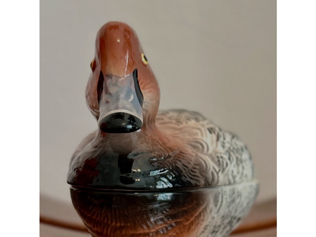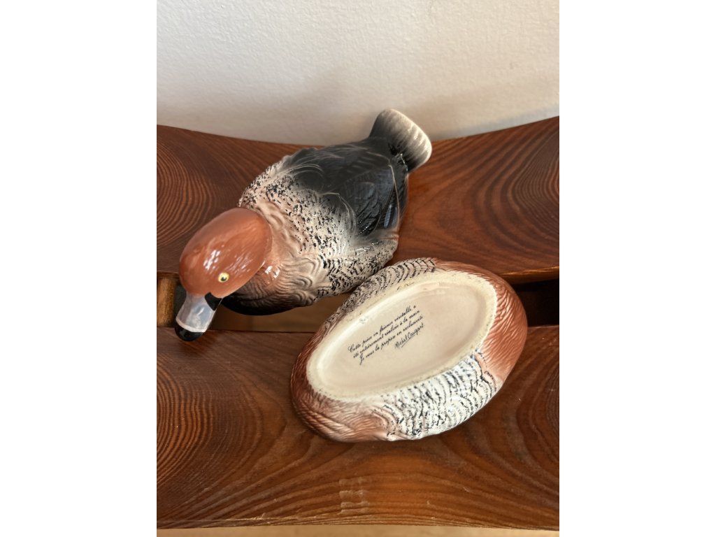 Vtipná keramická „kachna červenohlavá“, autorská dóza s poklopem francouzského výrobce fajáns Michela Cauganta, známého pro své originální teriny ve tvaru zvířat. Tato je ze 70. let, signovaná samotným umělcem ve spodní části a potvrzující 100% ruční práci a malbu.