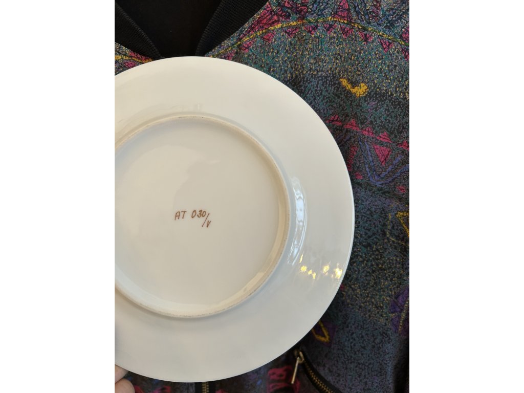 Dezertní talíř (19,5 cm) a jeden z nejzajímavějších talířů, jaké jsem kdy měla - má bohatý barevný dekor na lemu kombinující prvky z empíru, art deca a k tomu ten graffiti style - dokonalá eklektika osmdesátých let! Na zadní straně nemá klasickou značku porcelánky, ale ručně psané označení dekoru, nebo modelu - AT030/V. A běžný stolní porcelán se rozhodně neznačil ručně! Talíř mi tak zůstává záhadou a vy tak můžete ulovit možná raritní autorský kousek nebo prostě povedený postmoderní kousek do vaší kredence.