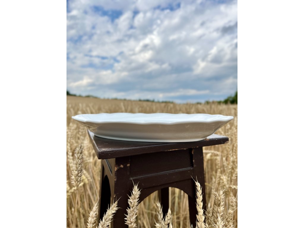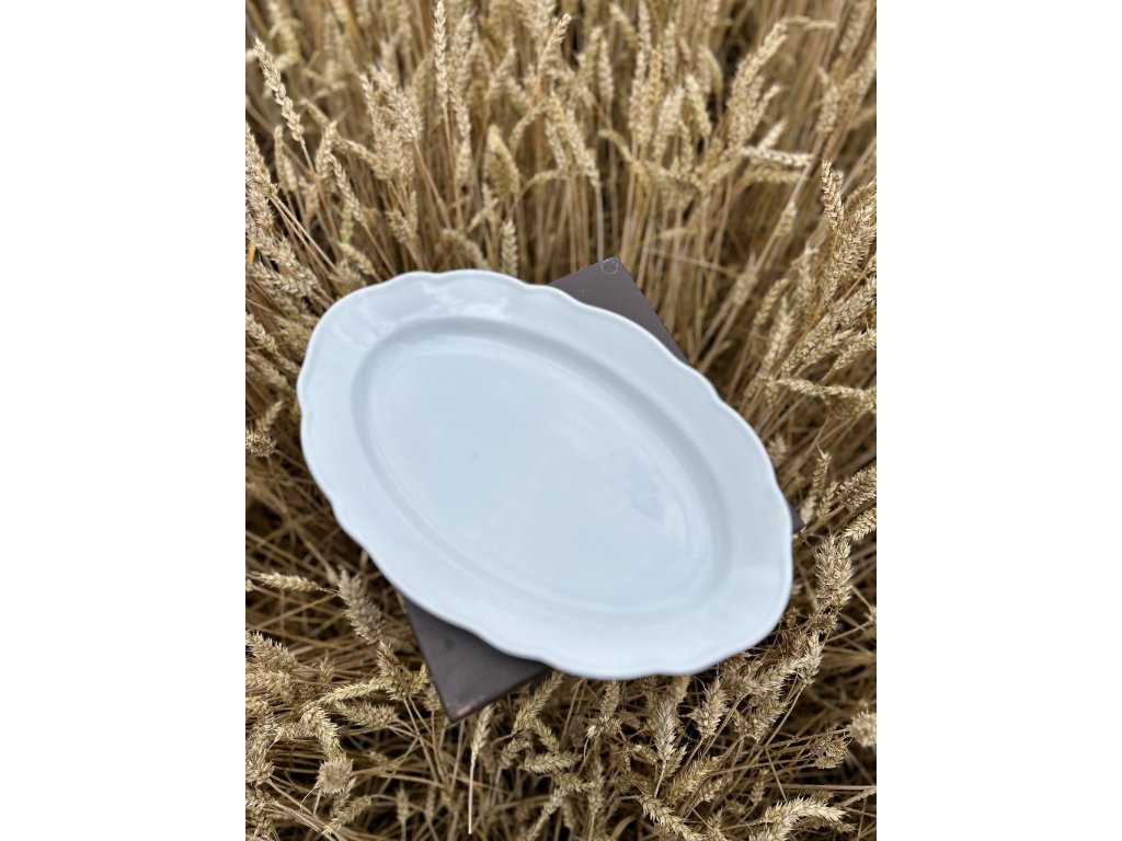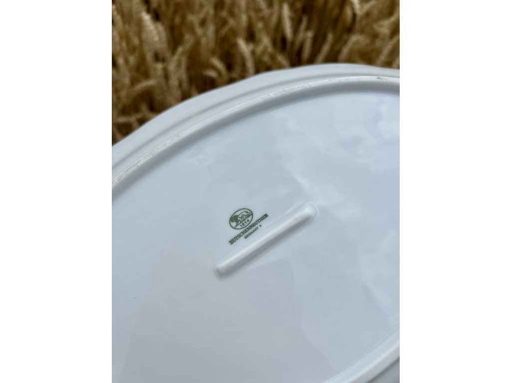 - Menší, zato svým dekorem velkolepý tác z významné německé porcelánky Hutschenreuther, založené již v roce 1814 (dnes součástí skupiny Rosenthal). Je ze slavné kolekce Maria Theresia, která se úspěšně vyrábí od roku 1929, a svými zvlněnými tvary vzdala hold klasickým dekorům z období panování císařovny Marie Terezie. Vyrábí se dodnes (na stránkách porcelánky k mání za 97,50 EUR!), měří 35 x 23 cm a je v perfektním stavu, jako nový (a podle značení také pochází z novější produkce).
