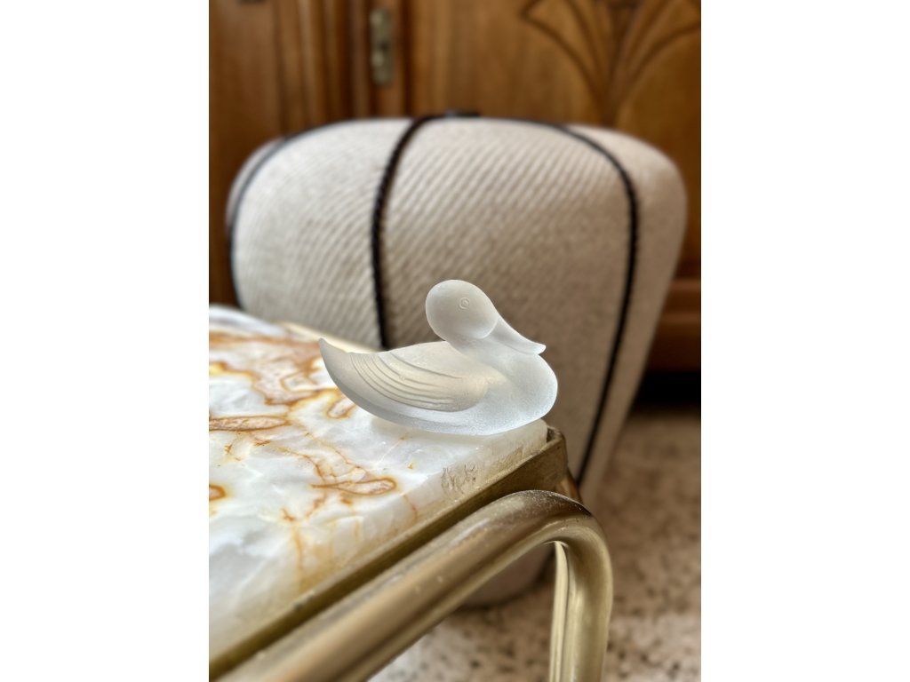 Malá skleněná figurka pravděpodobně železnobrodských skláren. Je z křišťálového skla, broušená, matovaná a úsměvné je, že naprosto stejný exemplář, ovšem se signaturou na dně, se na aukčních portálech prodává jako dílo Lalique. Kopírovalo se a kopíruje…