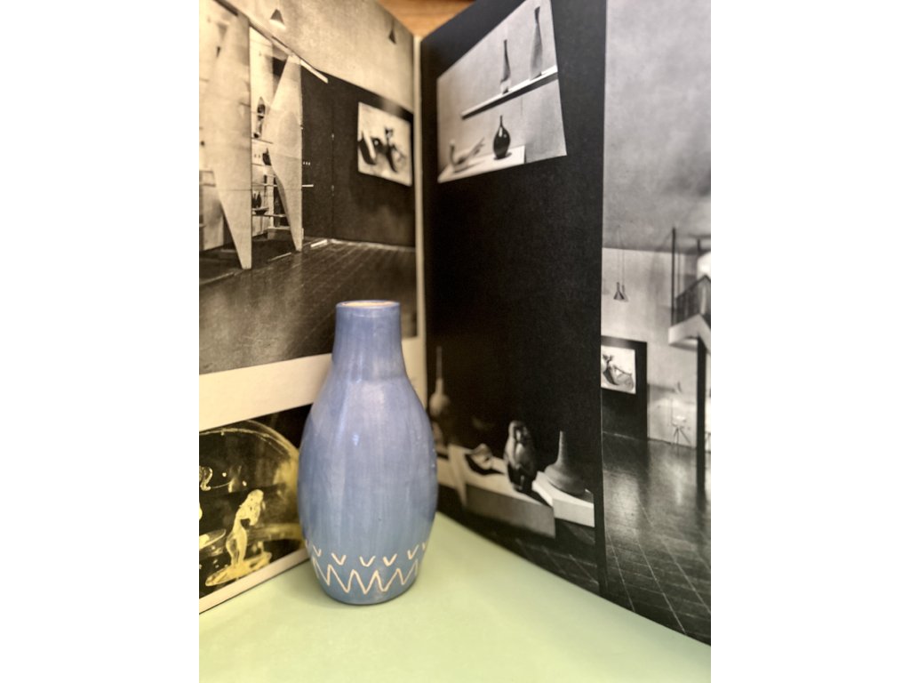 Autorská keramická vázička v půvabné baby blue barvě s vyrytým cik cak dekorem. Výška 13 cm, top stav. Autorskou značku na dně jsem bohužel nevyluštila.