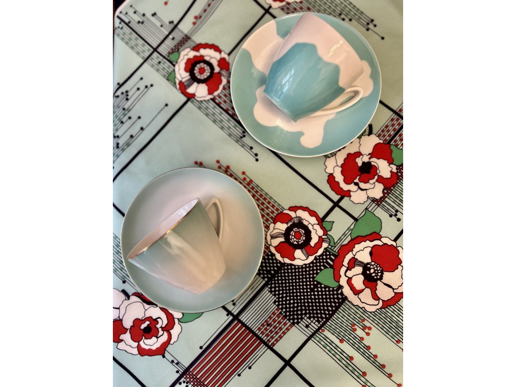 Vzácně vídané 120 ml šapo v tyrkysovém obláčkovém dekoru navržené Janem Hahnem a Jaroslavem Ježku pro porcelánku Loučky.