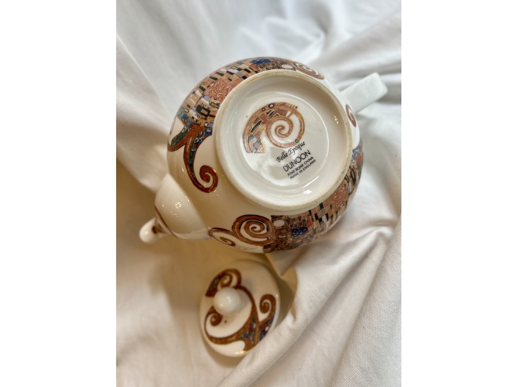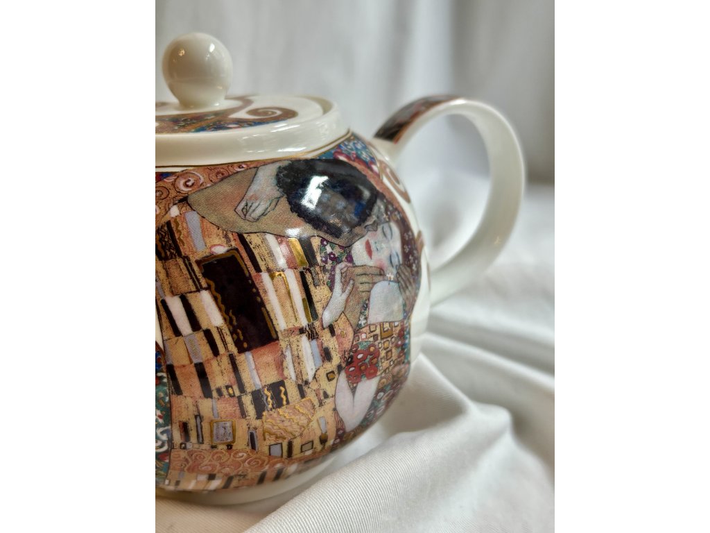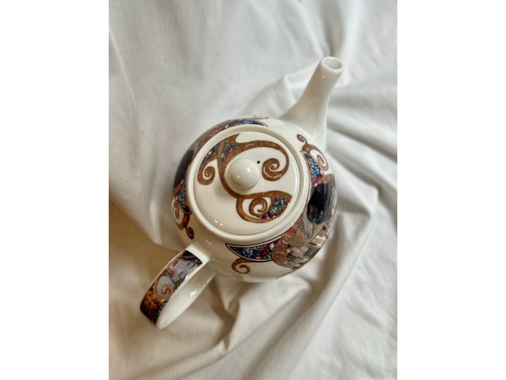 Veleznámý představitel vídeňské secese a symbolismu je i malíř Gustav Klimt, jehož zřejmě nejznámější dílo „Polibek“ z roku 1907 inspirovalo britského výrobce kostního porcelánu Dunoon k dekoraci této velké čajové konvice. Má objem 1,2 litru a je jako nová! Bohatý barevný potisk, použité 22karátové zlato a perfektní tvar. Potěší jako polibek při vašem odpoledním čaji!