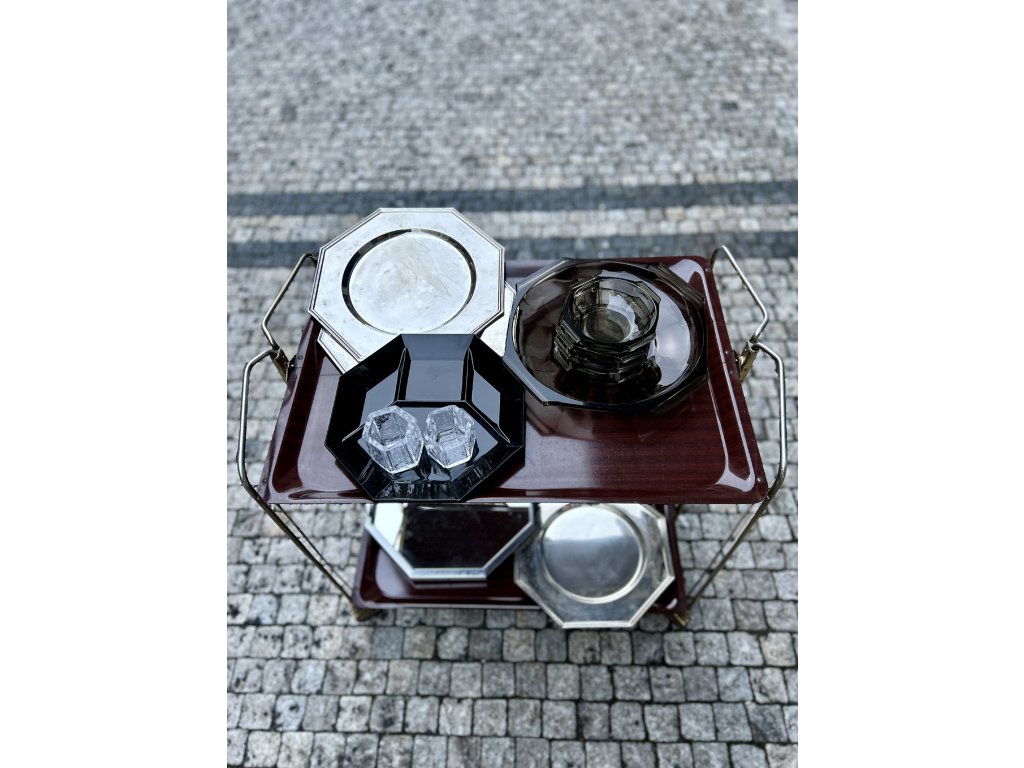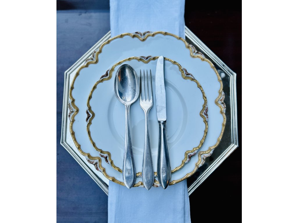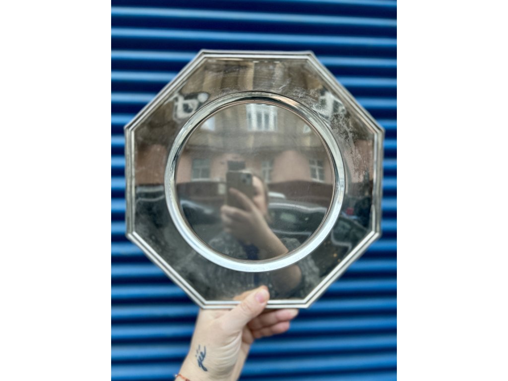 Kovové chromované talíře v osmibokém tvaru dovezené z Francie se používají jako „charger plates“ neboli podkladové talíře pro stolování.