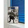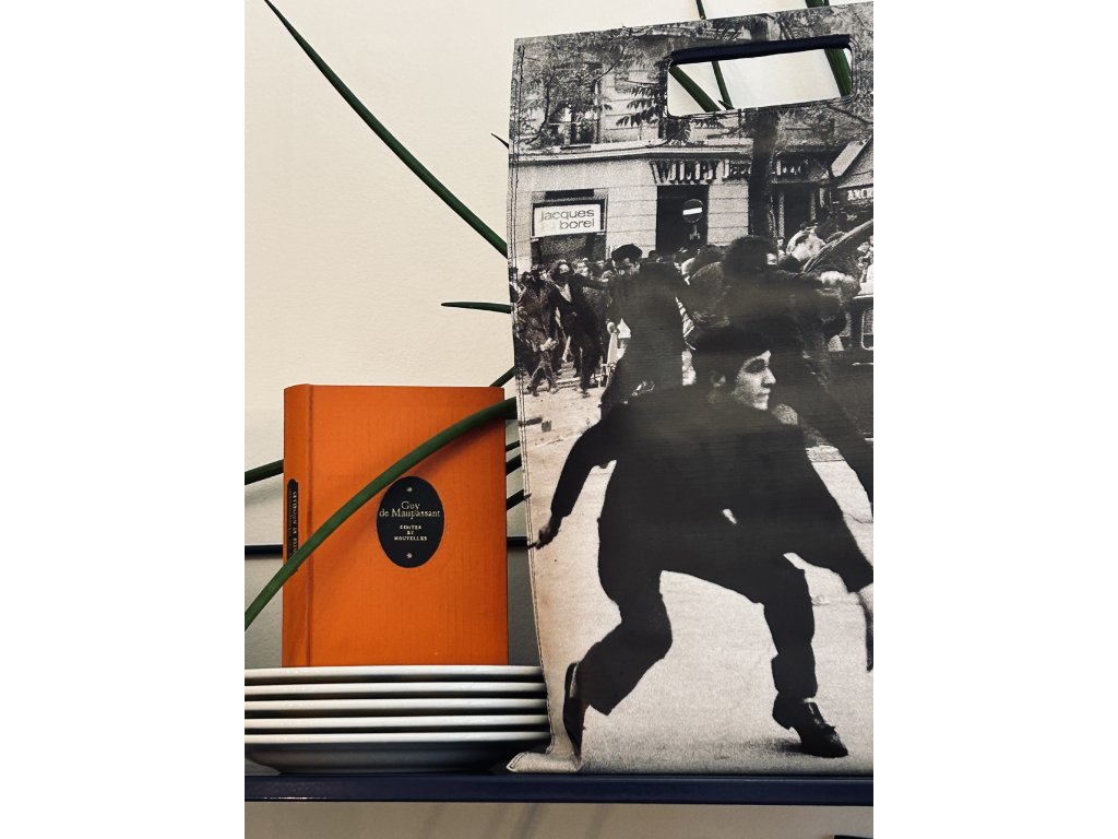 Designová taška šitá z bannerové plachtoviny, se slavnou fotografií z pouličních demonstrací 6. května 1968 na bulváru Saint-Germain v Paříži od Bruna Barbeyho. Z druhé strany černobílá část plakátu zvoucího na fotografovu výstavu ve Francouzském institutu v roce 2008.