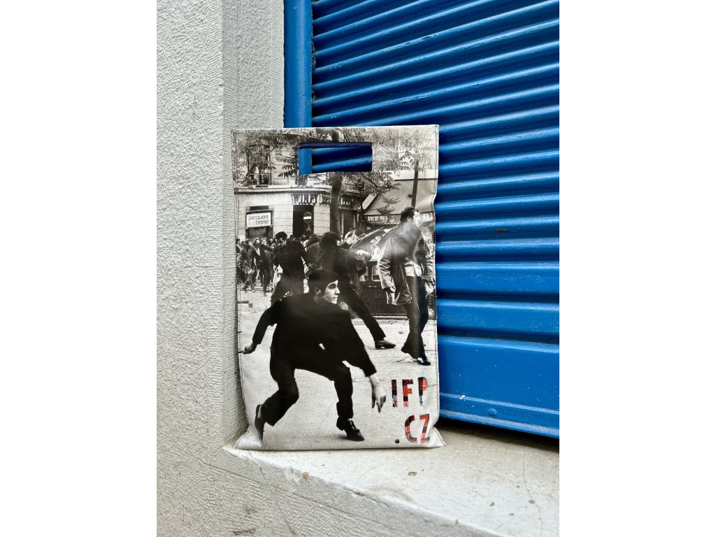 Designová taška šitá z bannerové plachtoviny, se slavnou fotografií z pouličních demonstrací 6. května 1968 na bulváru Saint-Germain v Paříži od Bruna Barbeyho. Z druhé strany černobílá část plakátu zvoucího na fotografovu výstavu ve Francouzském institutu v roce 2008.