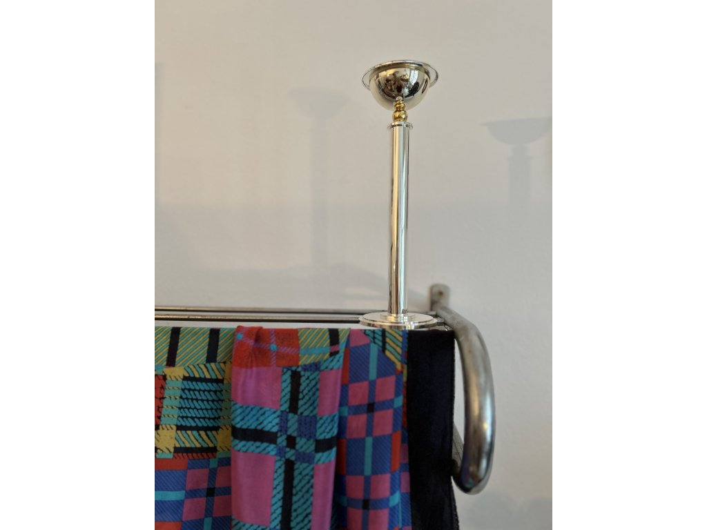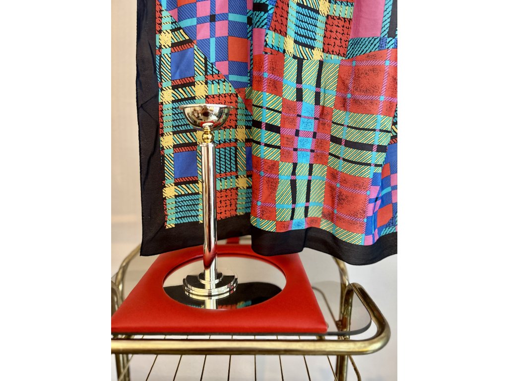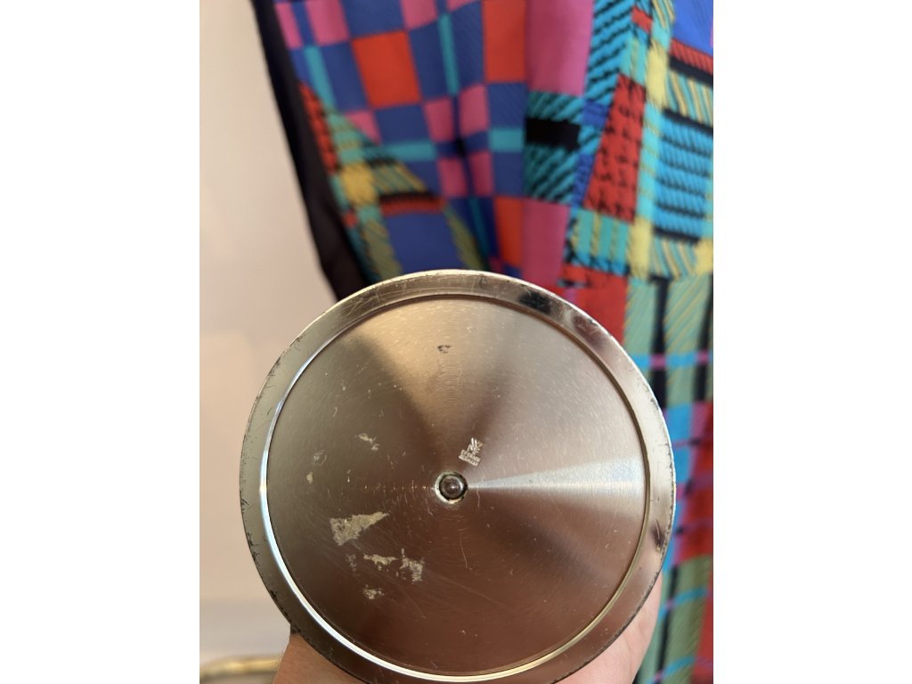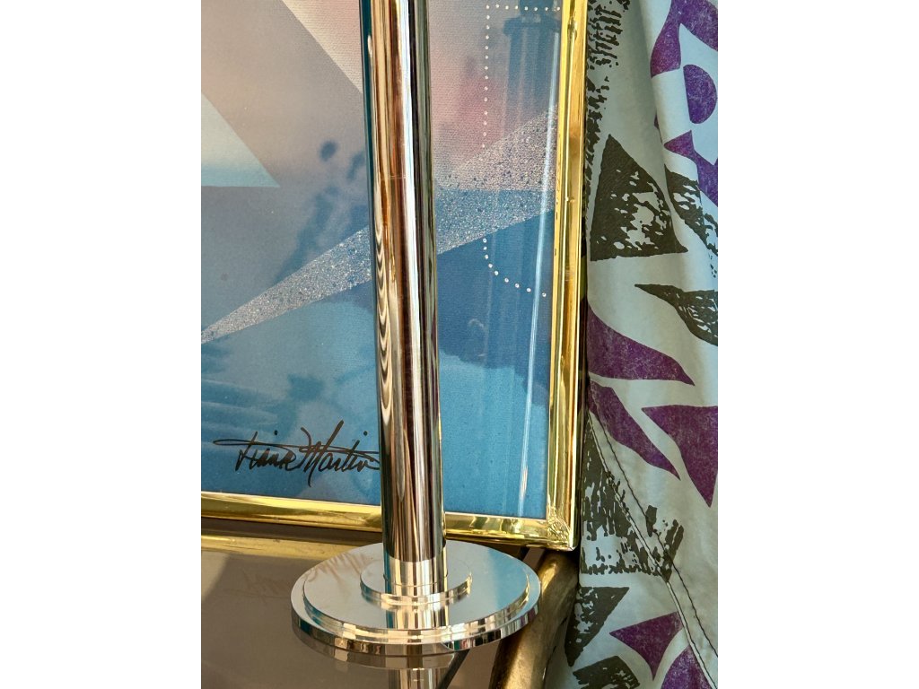Dokonalý Memphis svícen z postříbřené oceli německého výrobce WMF. Má kulovitou základnu z dvou soustředných kruhů, bytelnou nohu a na zlaté mosazné kuličce široký kalich na svíčku. Je velmi stabilní, s minimální patinou, značený, vysoký 25 cm a vaší tabuli dodá postmoderní elegantní lesk.