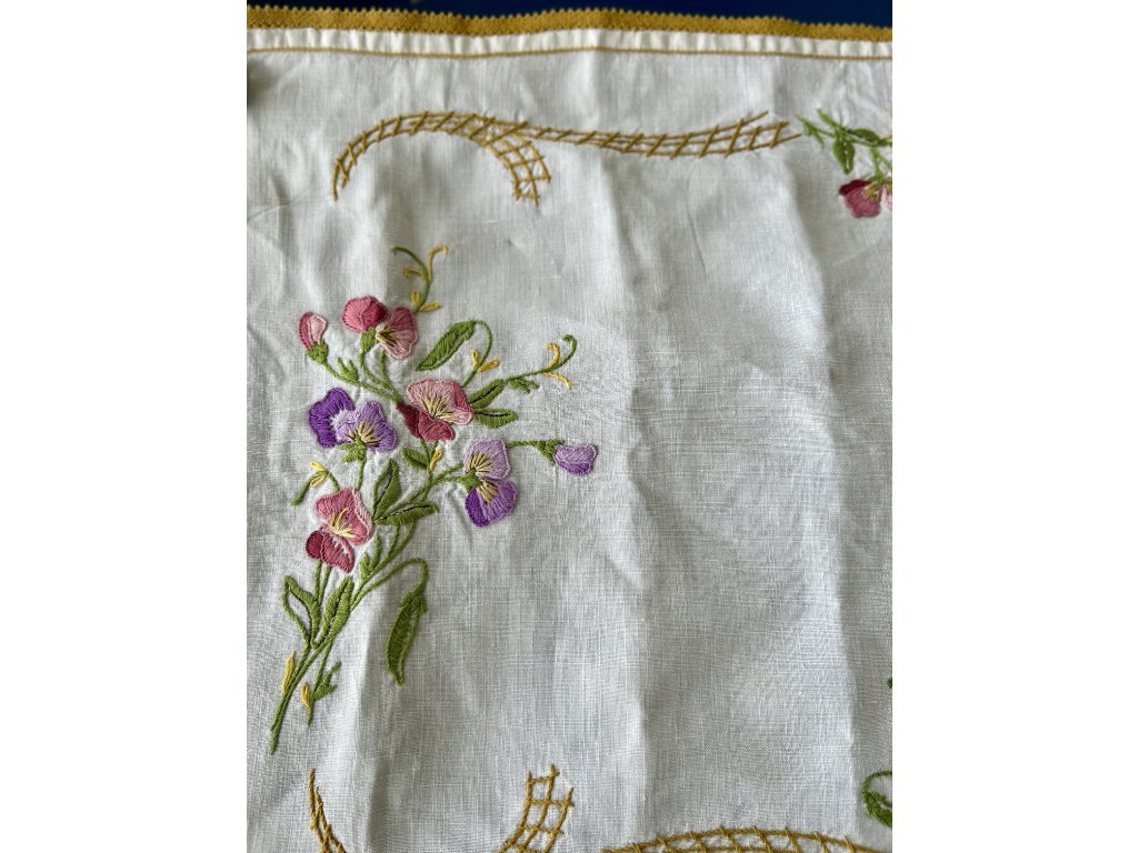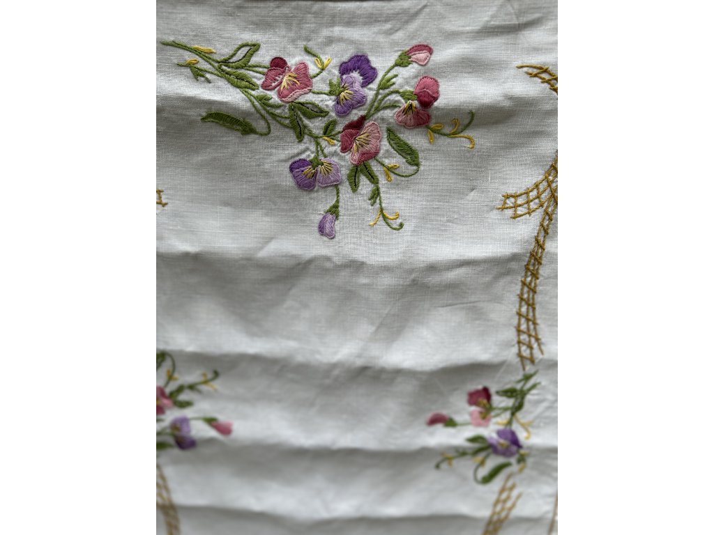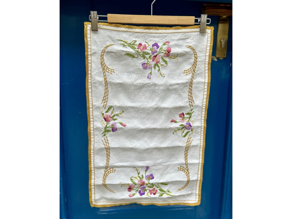 Vintage lněná dečka s pečlivou ruční výšivkou barevných květů, s vzadu milými poznámkami výšivačky psanými tužkou o tom, jak má být veden vzor. Naprosto bez vady, měří 57 x 36 cm.