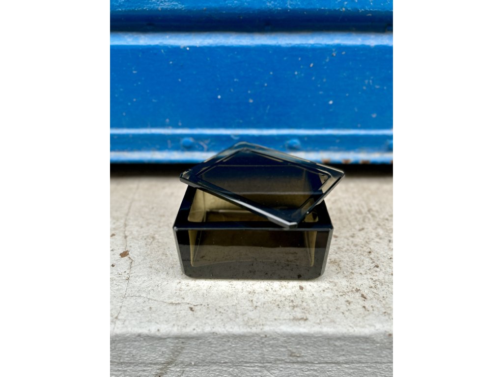 Zajímavá hranatá dóza s víkem v elegantním topazovém provedení a hranovaném skle. Jednoduchá funkcionalistická forma, v rohu víka stříbrným leptem a dobovým fontem vyvedené inicály FB. Má drobné otěry a ťuky hlavně na spodních hranách víka, celkově je v krásném stavu a měří 11 x 9 x 6 cm.