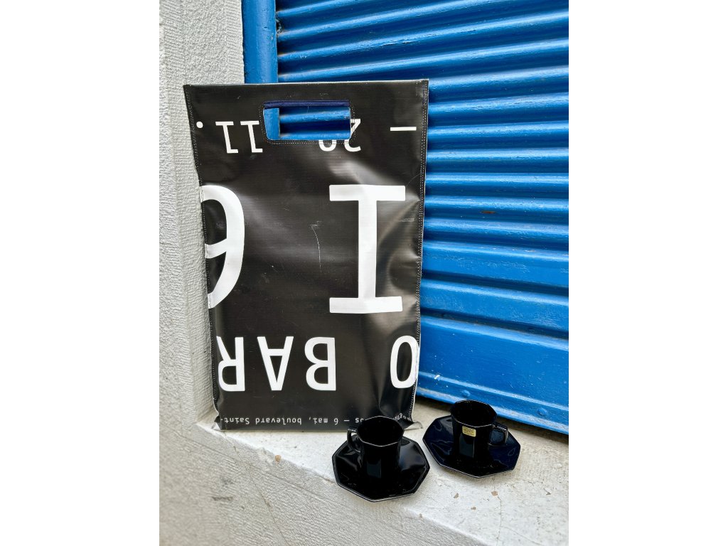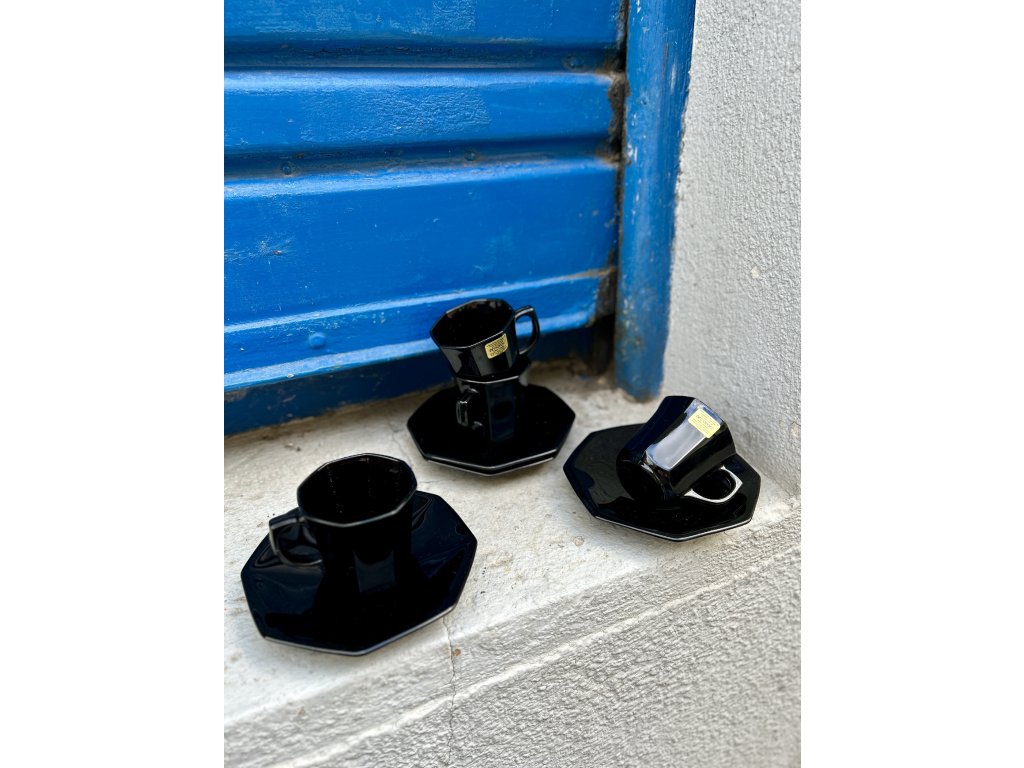 Geometrické 8hranné šálky s podšálky z černého skla jsou ikonickými výrobky ze série Octime firmy Arcoroc, oblíbené od let 1980s pro svou odolnost tvrzeného skla, které je velmi těžké poškrábat či rozbít (údajně až 5x silnější než běžné sklo nebo porcelán). Pololesklé provedení, lehké k vyleštění, objem 80 ml a ještě původní nálepka výrobce.