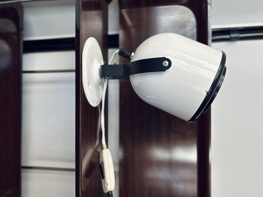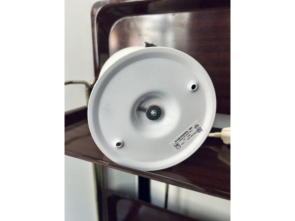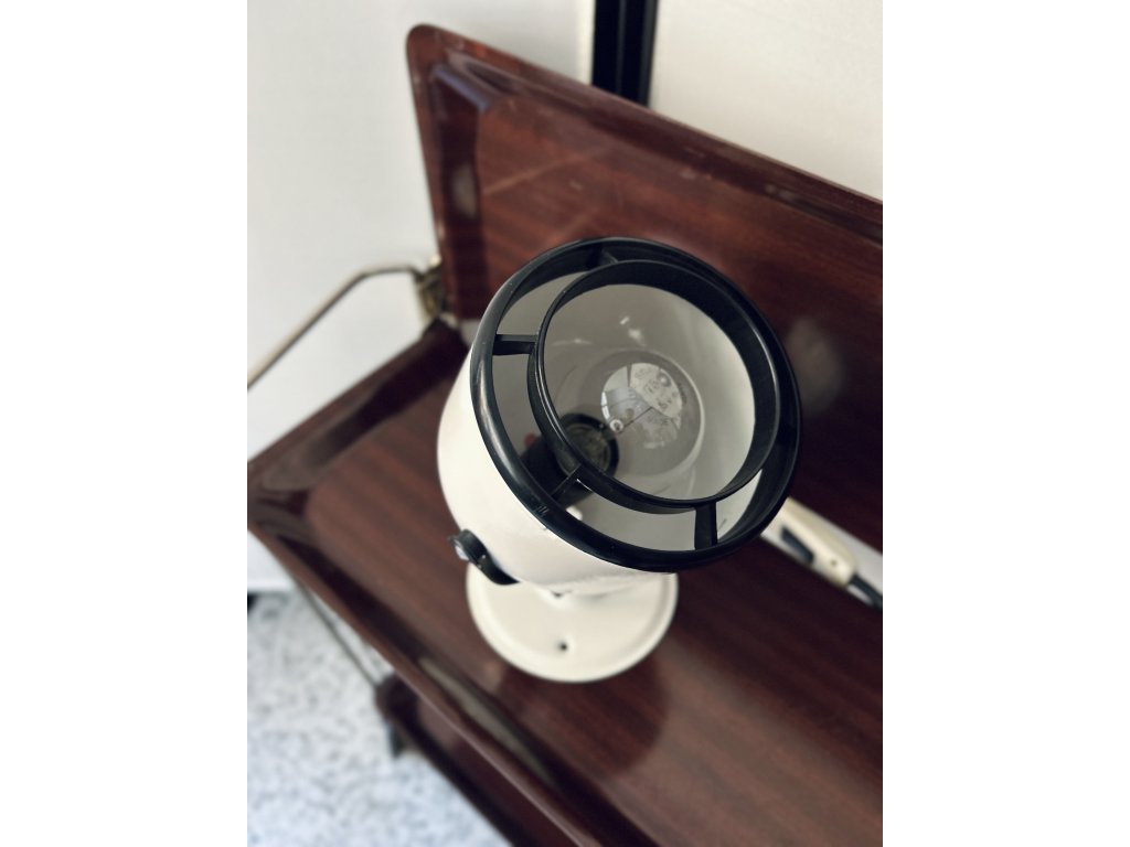 Svou širokou podstavou je určená pro dvojí použití: přišroubovaná na zeď i položená na desku stolu. Má otáčecí hlavu do 180 stupňů, kombinuje bíle lakovaný kov s detaily v černém plastu a celkově má „reflektorový“ vzhled v duchu 1970s space age stylu. Měří 22 cm na výšku, průměr svítidla je 13 cm. Má nepůvodní kabel s vypínačem, vše je funkční, zkontrolované elektrikářem. V krásném stavu jen s lehkými stopami času na bílém laku.