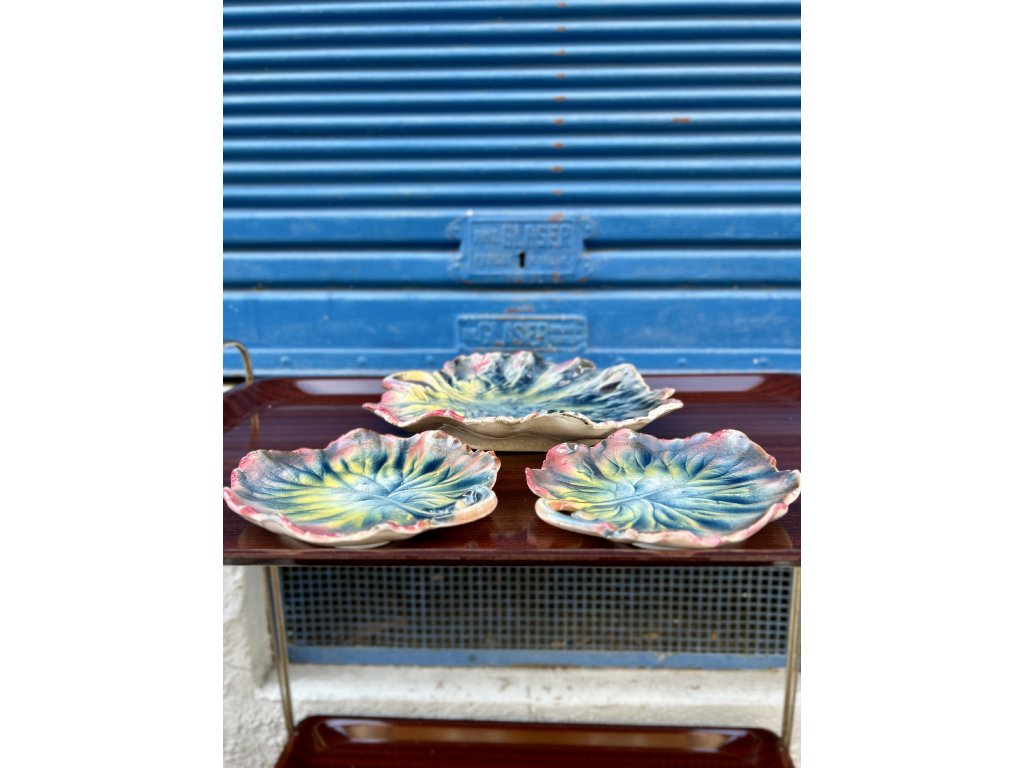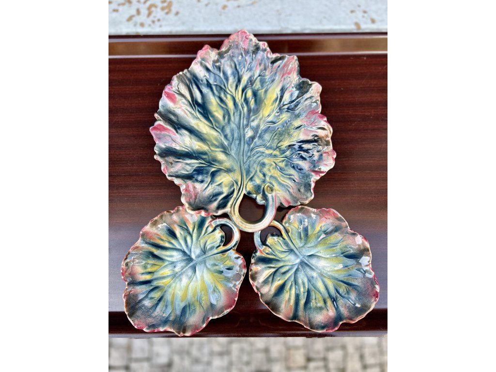 Z jemné křehčí keramiky, neboli bělniny, je vyroben i tento set servírovacího tácu a dvou talířků ve tvaru vinného listu z konce 19. století. Nádherné výrazné barvy, které se prolínají na profilovaném těle talířů, okouzlí svou secesní dekorativností a ruční prací. Kousky nejsou značené, ale budou pravděpodobně z dílny Josefa Seidla ze Znojma.