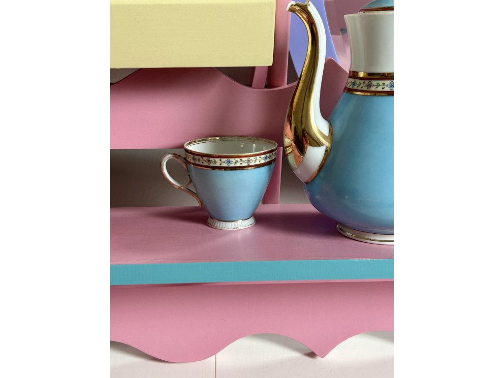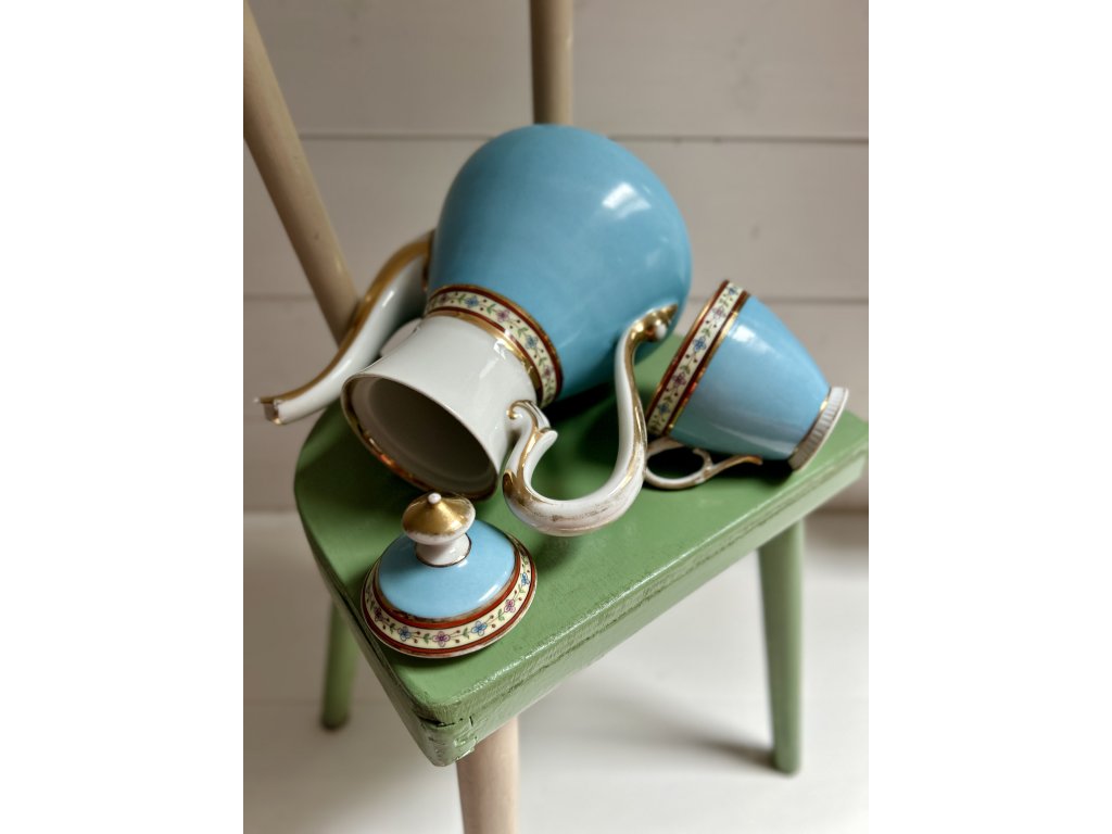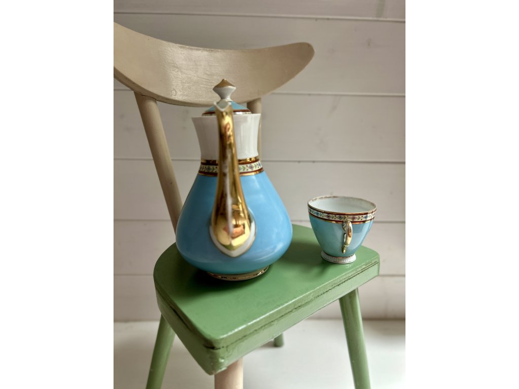 Nádherná čajová konvice z kostního porcelánu zdobeného pastelovou modrou, bohatým zlacením a ručně malovanými barevnými kvítky. Krásný příklad karlovarské produkce z období biedermeieru a poloviny 19. století, kdy se ještě vše zdobilo ručně, ne potisky (nemá značení). Konvice má běžné otěry způsobené používáním a v jednom rohu ostřejší hubičku, ale nemá jediný oťuk či vlásek, což je při jejím stáří skoro zázrak. Uvnitř je filtr na čajové lístky a měří 22 cm.