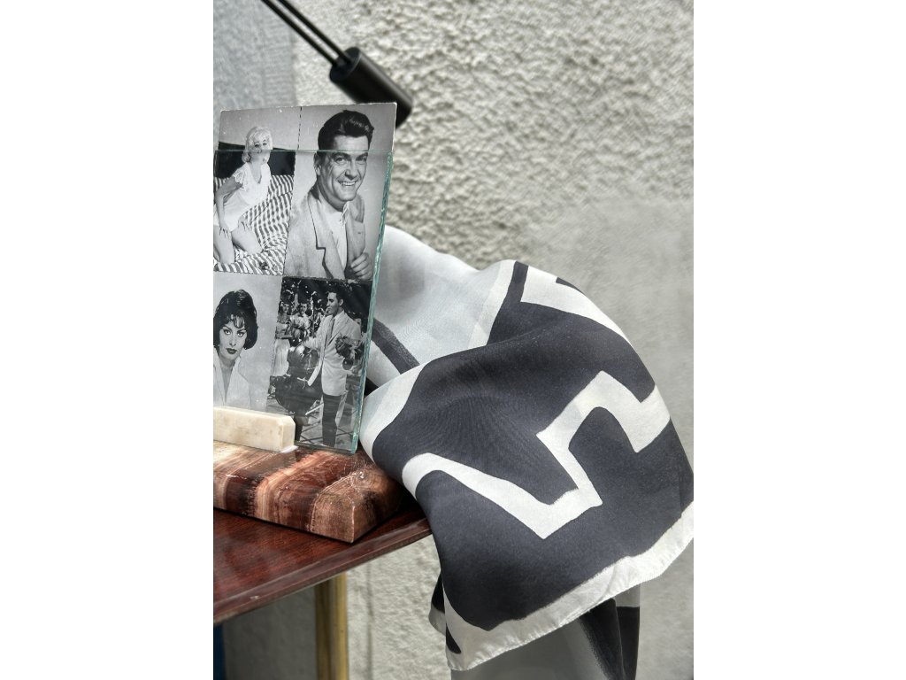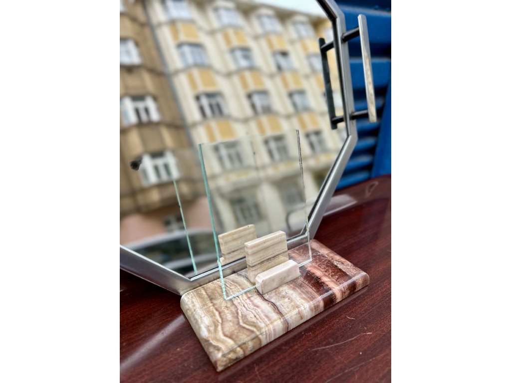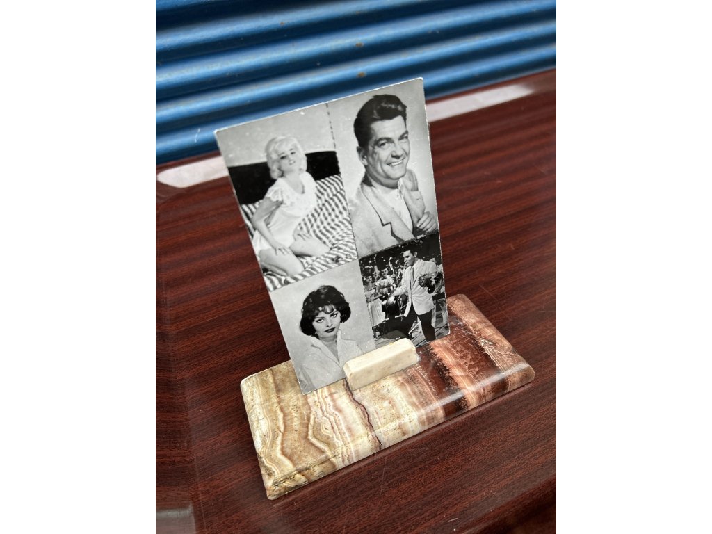Starožitný rámeček na fotku z krásně prokresleného hnědého mramoru, který jde od zlatě béžové až do temně vínové. Má menší původní skla (12 x 9 cm), ale vzhledem k vysokému zadnímu stojánku lze použít i bez nich (nebo si nechat uříznout u sklenáře větší).
