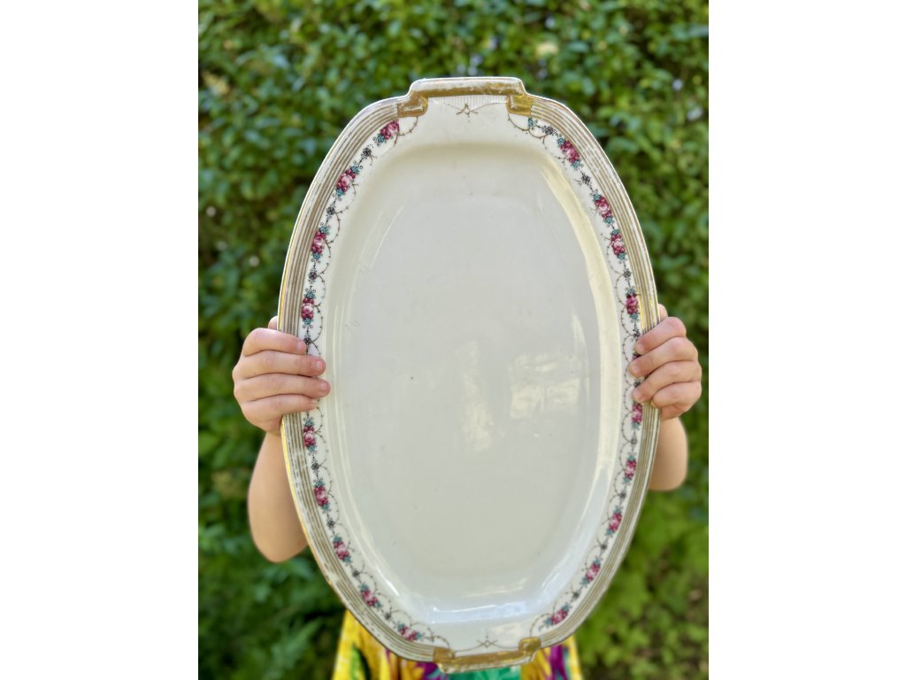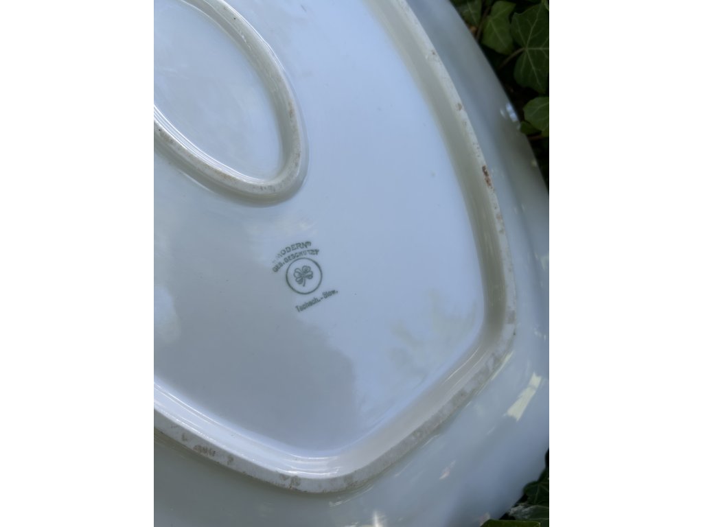 - Velký tác (délka 40 cm, šířka 26) z porcelánky Merklín z období 2. republiky (značeno, série „Moderne“). Kombinace ručně malovaných zlatých linek a růžičkových girland na profilovaných lemech.