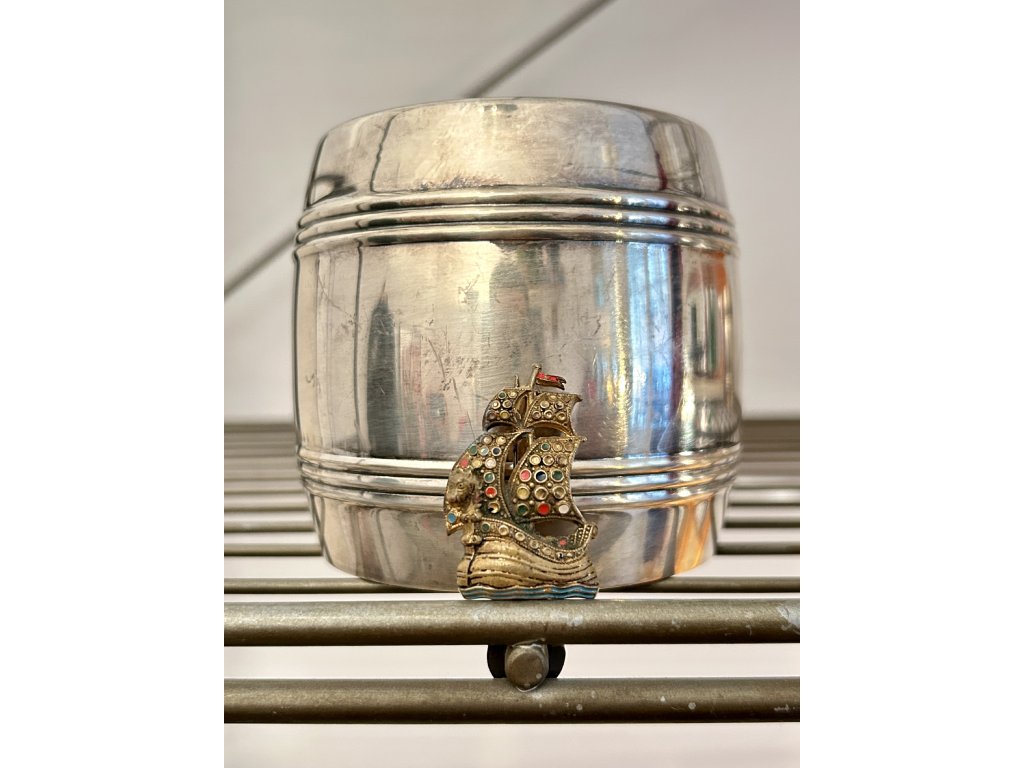Dvě postříbřené kovové nádoby v typickém tvaru whiskey soudků pro podávání nápoje „Mint Julep“ na bázi whiskey, máty, cukru a vody. Jeho tvar navrhl Asa Blanchard, jeden z nejuznávanějších amerických stříbrníků 19. století, a největší popularitu získal na koňských dostizích. Já v nich ale vidím cenné zásoby pitiva pro dlouhé plavby po moři, jo ho ho…
