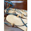 Moje záliba v římských sandálech s vázáním kolem lýtek léty vyvanula stejně jako římská říše, takže tyto kožené sandály jsem neměla NIKDY na sobě. Opět luxusní značka Adolfo Dominguez, jsou velikosti 41, celokožené a mají dlouhé hnědé, černé a modré šňůrky na vázání buď pro šikovné až nahoru ke koleni nebo jen kolem kotníků. Podrážky jsou bytelné, gumové, žádný papírový aušus. Šňůrky jsou do poutek volně vložené, můžete je vyměnit za jakékoliv stuhy či pásky vaší volby.