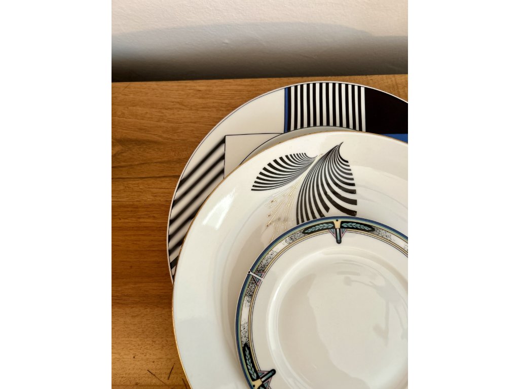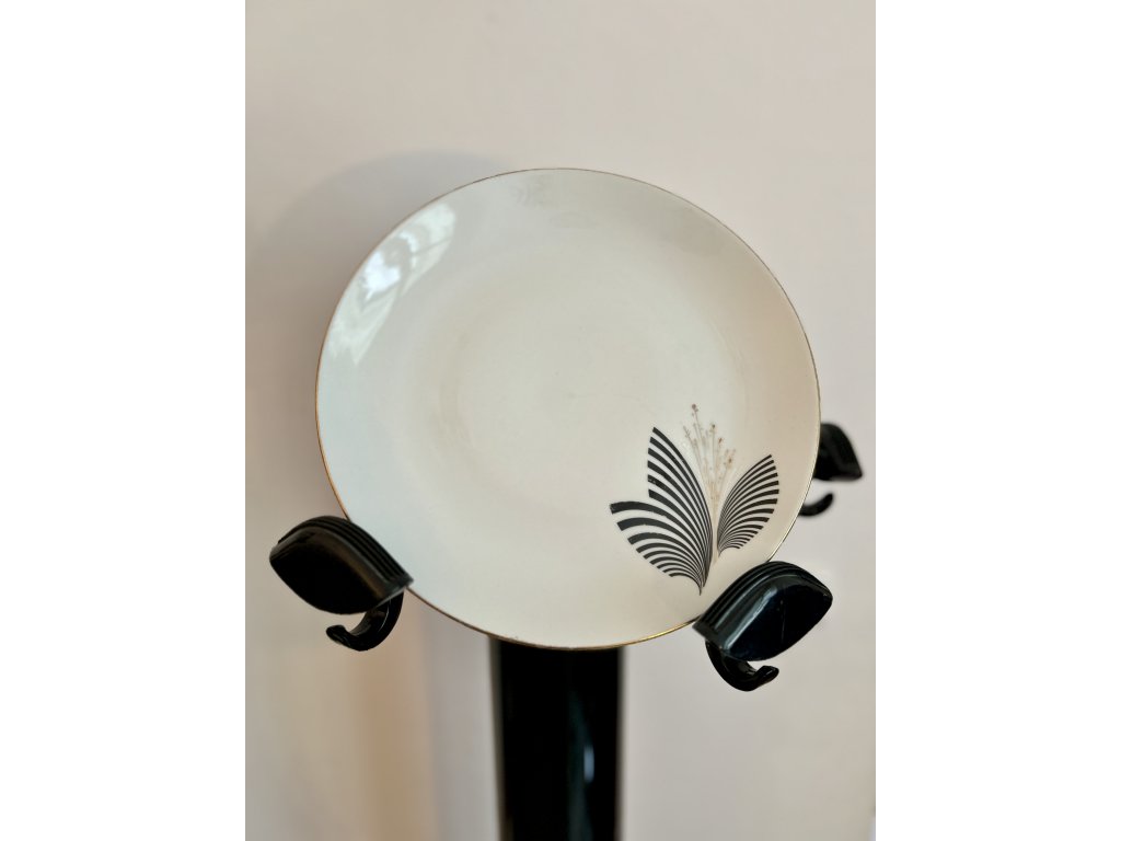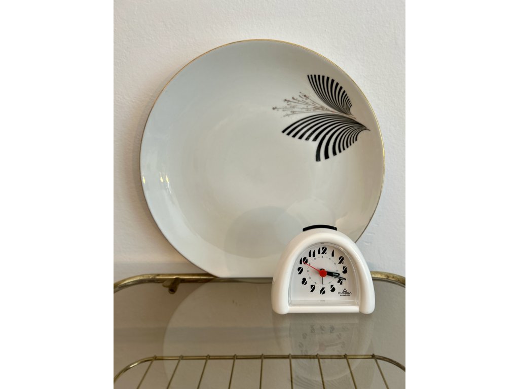 Bílý servírovací tác s černým op-art dekorem a jemným zlacením z československé porcelánky Bohemia, lehké známky používání, průměr 30 cm.