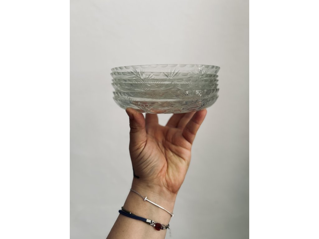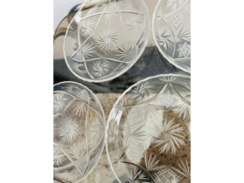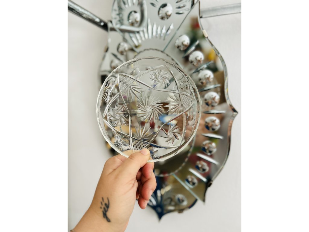 Precizně a bohatě broušené talířky na dezerty z olovnatého křišťálu s tím nejkrásnějším brusem kombinujícím hvězdy a slunce. Mají lehce zvedlý lem, průměr 16 cm a několik mikrošupin na lemu v obloučkovém brusu, kde naprosto zanikají. Budou velmi dekorativní pro odkládání šperků a svým vybroušeným stylem povýší na luxusní úroveň i punčový řez.