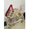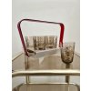 Praktická sada šesti 1dl odlivek v plastovém držáku s madlem; československá a velmi povedená variace na space age design. Odlivky jsou z kouřového skla s hvězdným potiskem ve zlatě a držák v červeno-mléčném plastu, vše v top stavu. Na lehké popíjení v duchu atomového věku!
