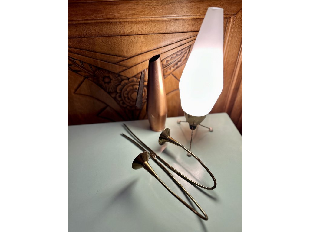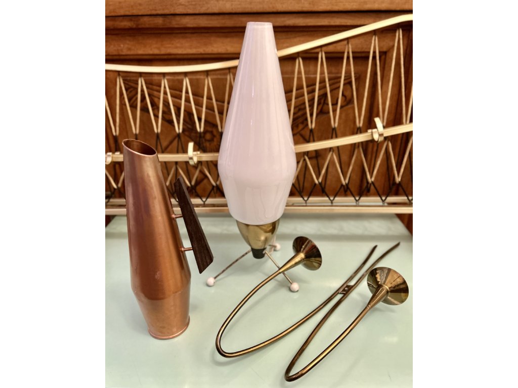 Ikonický příspěvek československé produkce do začínající světové fascinace vesmírným závodem a #spaceage stylu je tato 32 cm vysoká bruselská lampička “Raketa” navržená Stanislavem Kučerou v 60. letech. Vyrobil ji závod v Kamenickém Šenově a tvoří jí vrstvené silné mléčné sklo a mosazná základna na 3 nožičkách s plastovými kuličkami na konci. Kov má lehounkou patinu, původní elektroinstalace je zkontrolovaná a svým náladovým světlem tak může odstartovat u vás doma!