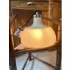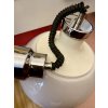 Vintage kuchyňská stahovací lampa s plastickým bílým širmem dokonale imitujícím opálové sklo, které v 70. letech navrhl velmi pravděpodobně italský designér Luigi Massoni pro Harvey Guzzini/Meblo (je značená Made in Italy, 1972). Kryje ji výrazný plastový kryt v barvě slonové kosti s pochromovaným kovovým vrškem, odkud se vine pevná spirála textilního kabelu omotaná kolem navíjecího zařízení (patentované Rolly) až k horní části opět z výrazného chromového baldachýnu. Širm je široký 42 cm a na výšku má včetně krytu 32 cm. Na vnitřní části, ve které je upevněná objímka, je chromové táhlo. Na délku má v klidu 80 cm a pouhým stlačením širmu dolů se natáhne na skoro dvojnásobek délky! Je v super stavu, má jen lehké stopy užívání a patinku.