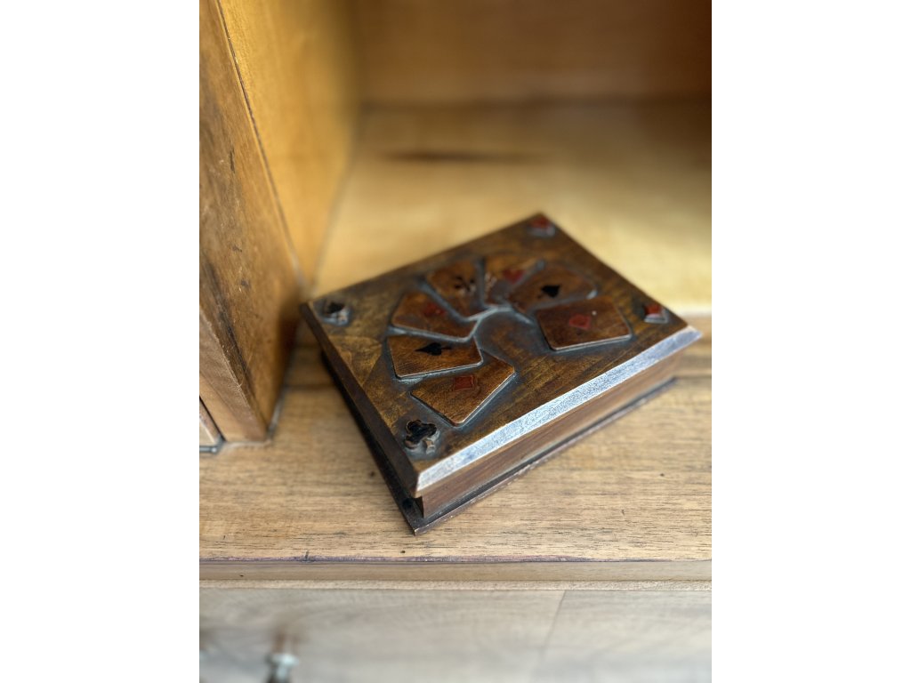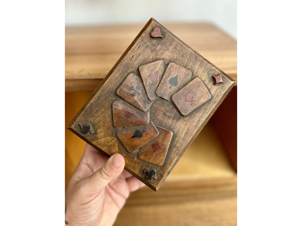 Starožitná dřevěná kazeta na karty (17x14x5 cm), ručně vyřezávaná a malovaná, z cca 30. let 20. století. Tyto staré karetní krabičky jsou velmi vyhledávané sběrateli a mají velké kouzlo.