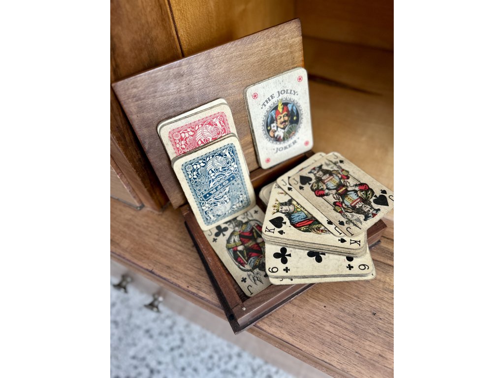 V této jsou navíc původní 2 kompletní série žolíkových karet s nádhernými kresbami značené OTK (n.p. Obchodní tiskárny Kolín), s lehkou patinou, kterou jim dal čas (ale jsou rovné, dobře se drží). I ty jsou v hledáčku sběratelů! Krásná příležitost získat 2 poklady v 1 pro milovníka karbanu.