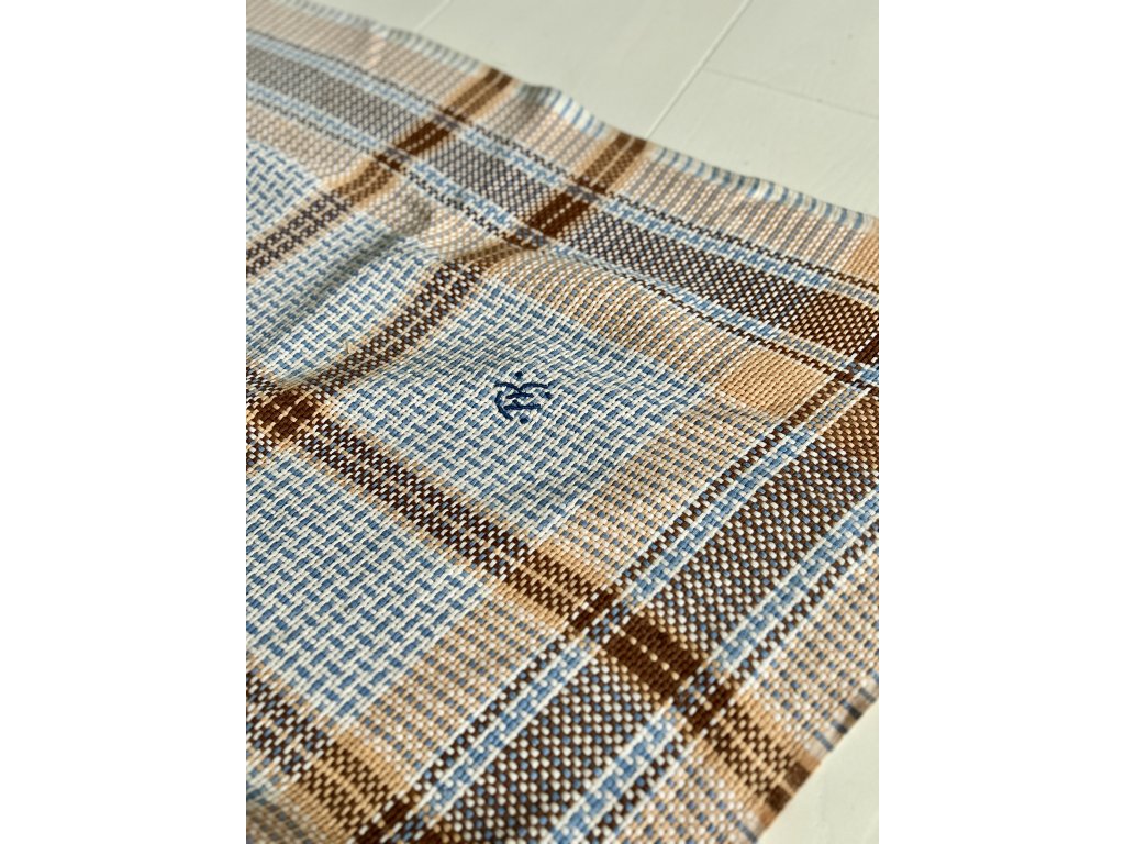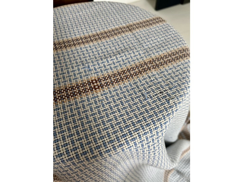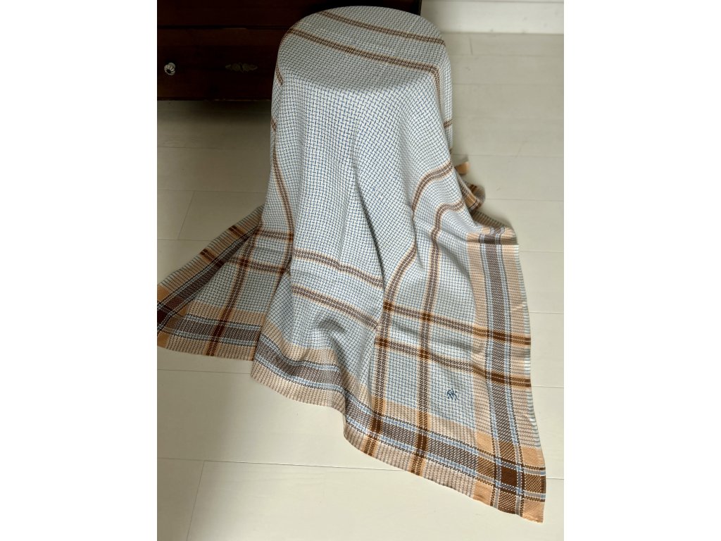 Dokonalý „upletený“ starožitný ubrus, výjimečná tkaná čistě bavlněná textilie s volnější vazbou v jemných barvách, kterým dominuje holubí modř a odstíny béžovo-hnědé. Měří 140 x 132 cm a má vyšitý monogram FK! Má pár stop času na látce jako vytaženou přízi či povolenou vazbu, ale žádné díry ani zašití.