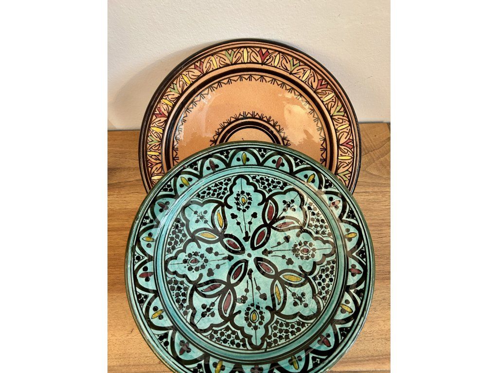 Dvě dekorativní mísy z červeného jílu zdobené zemitými barvami a ornamentálním dekorem typickým pro Maroko a jeho keramiku z přístavu Sáfí, ceněnou sběrateli. Jedna má okrovou barvu písku, druhá teplou tmavě tyrkysovovou, obě s nenápadnými barevnými akcenty; jsou široké 27 a 26 cm a na zvýšené noze, o celkové výšce 7 cm. Jsou značené, z 80. let a v nádherném stavu (tyrkysová má na jednom místě opravený lem). Obě velmi těžké, se závěsem na pověšení, ale ideální na servírování ovoce.
