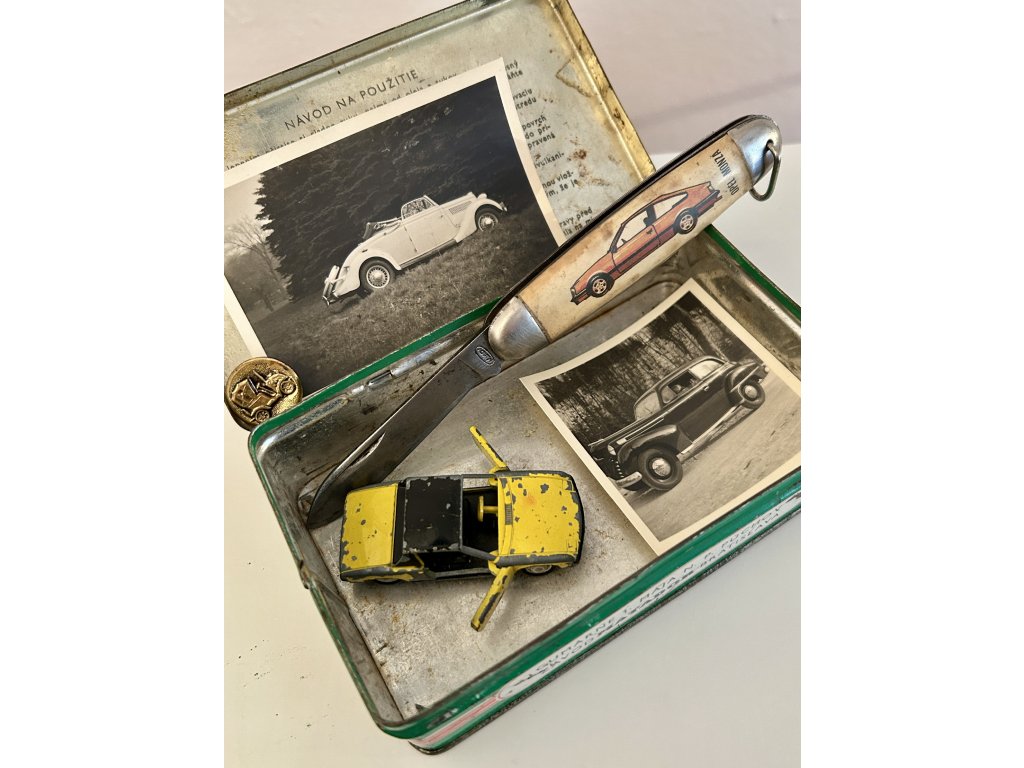 Stará plechové krabička s konvolutem drobností pro milovníky starých aut: