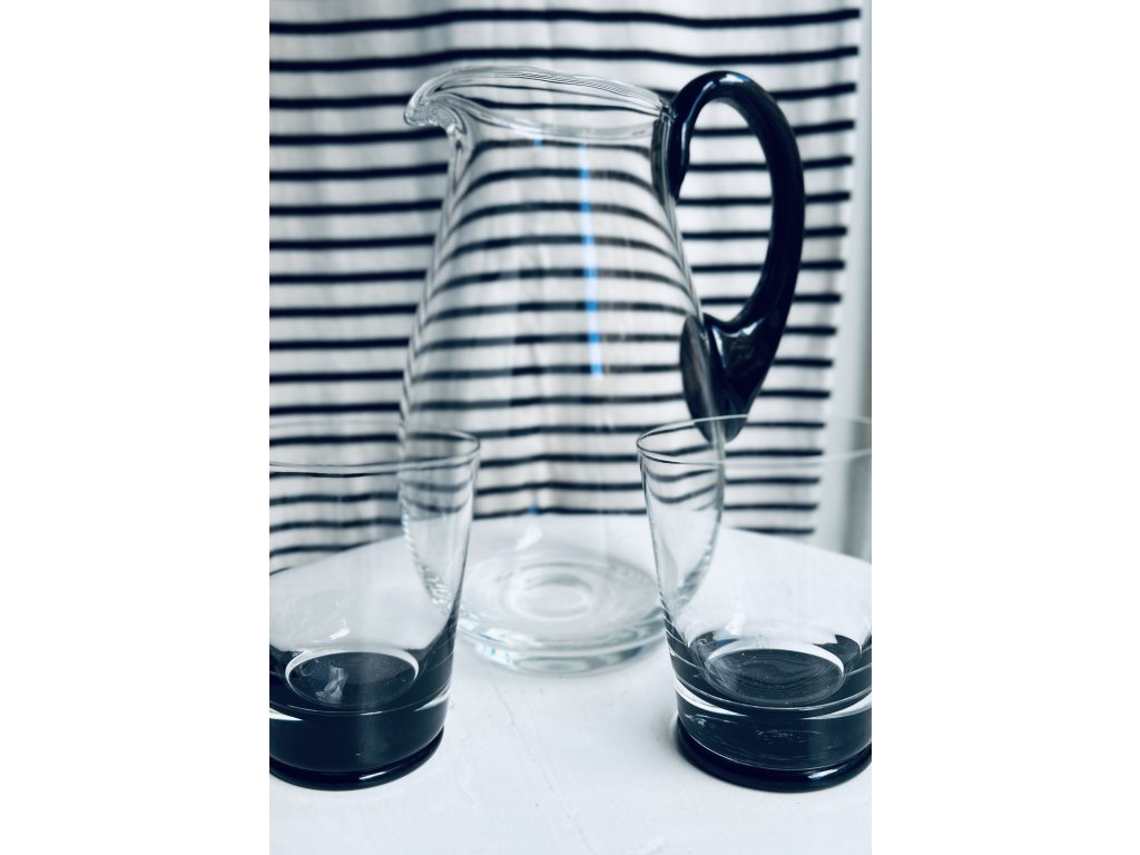 Set nižších sklenic typu „old fashioned“, tedy na whiskey či short drinky či nealko. Povedené ručně foukané hutní sklo s rafinovaným efektem černého dna, které se odráží v masivní základně sklenice a vytváří efekt dvojího dna. Nádherné vintage kousky nejstarší sklárny u nás, v Novém Světě v Harrachově.